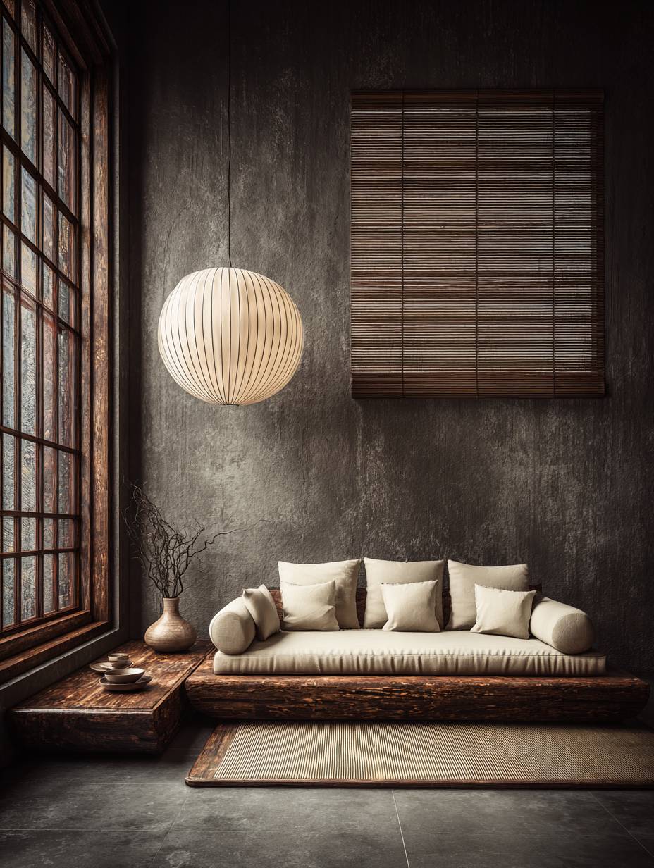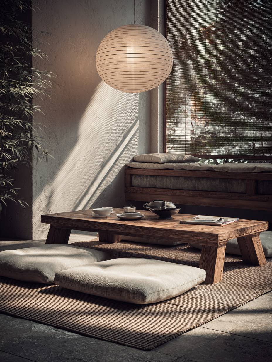 A tatami-style mat defines the seating area, introducing the traditional Japanese flooring material that provides both comfort and cultural authenticity to the design. The tatami’s woven texture adds visual and tactile interest while its natural straw composition contributes to the room’s organic, earthy character. Above the seating area, a paper lantern pendant provides soft, diffused ambient lighting that filters through the paper to create a warm, gentle glow without harsh shadows. This lighting approach exemplifies the Japanese concept of indirect illumination that creates atmosphere rather than simply providing visibility.