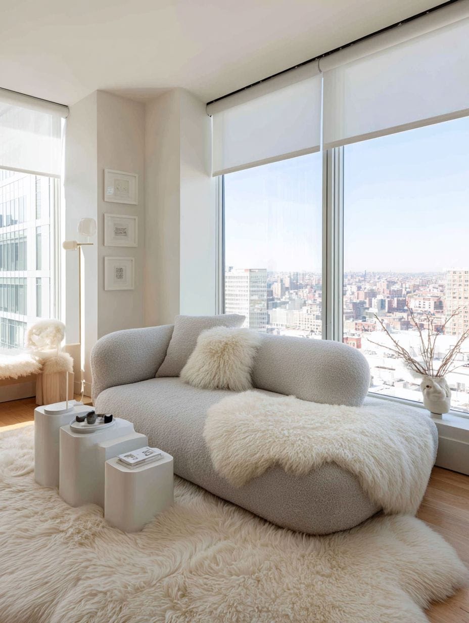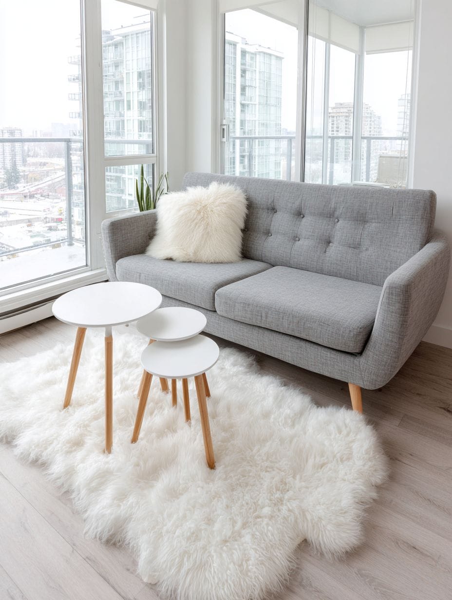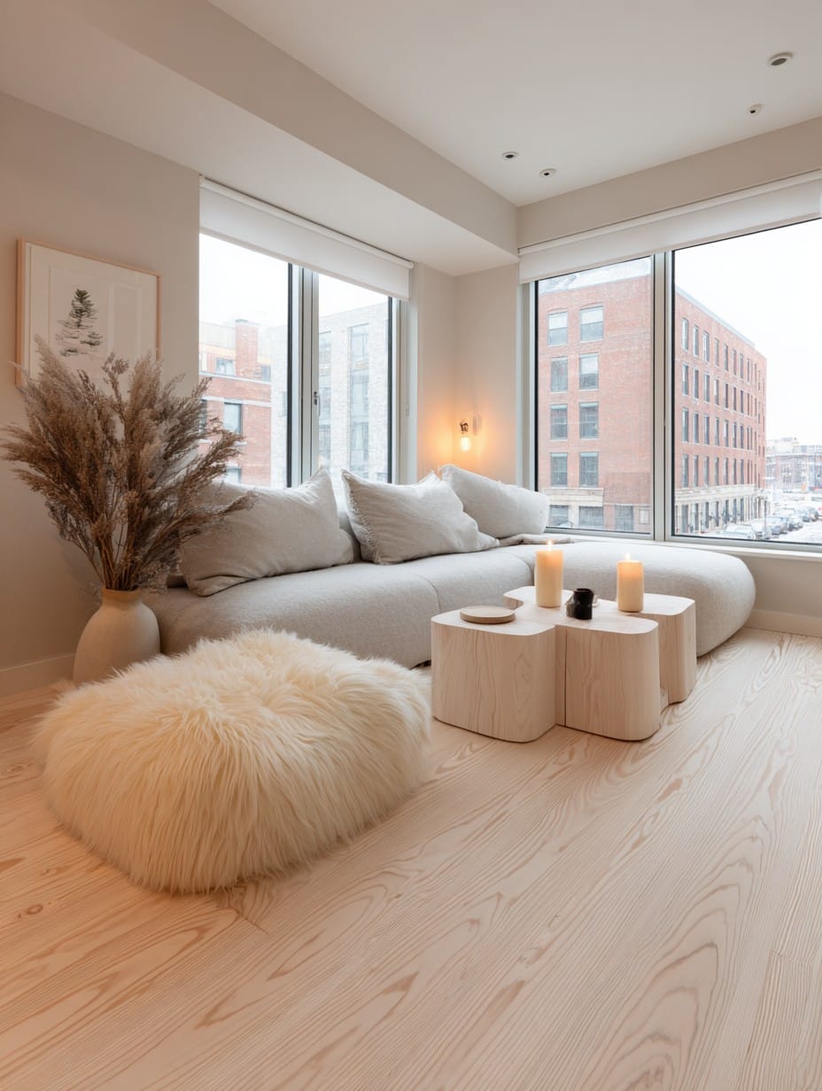 Scandinavian design has long championed the principle that minimalism need not be cold or unwelcoming, and this concept beautifully illustrates that philosophy. A light grey wool sofa serves as the room’s centerpiece, its soft texture and neutral tone creating an inviting foundation for the space. The addition of a single sheepskin throw introduces natural luxury and tactile appeal, demonstrating the Scandinavian approach of incorporating cozy elements that enhance comfort without creating visual clutter. The sheepskin’s organic shape and natural texture prevent the space from feeling too controlled or rigid.