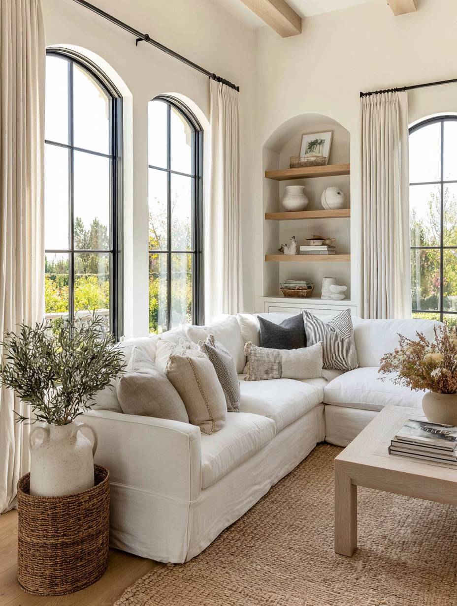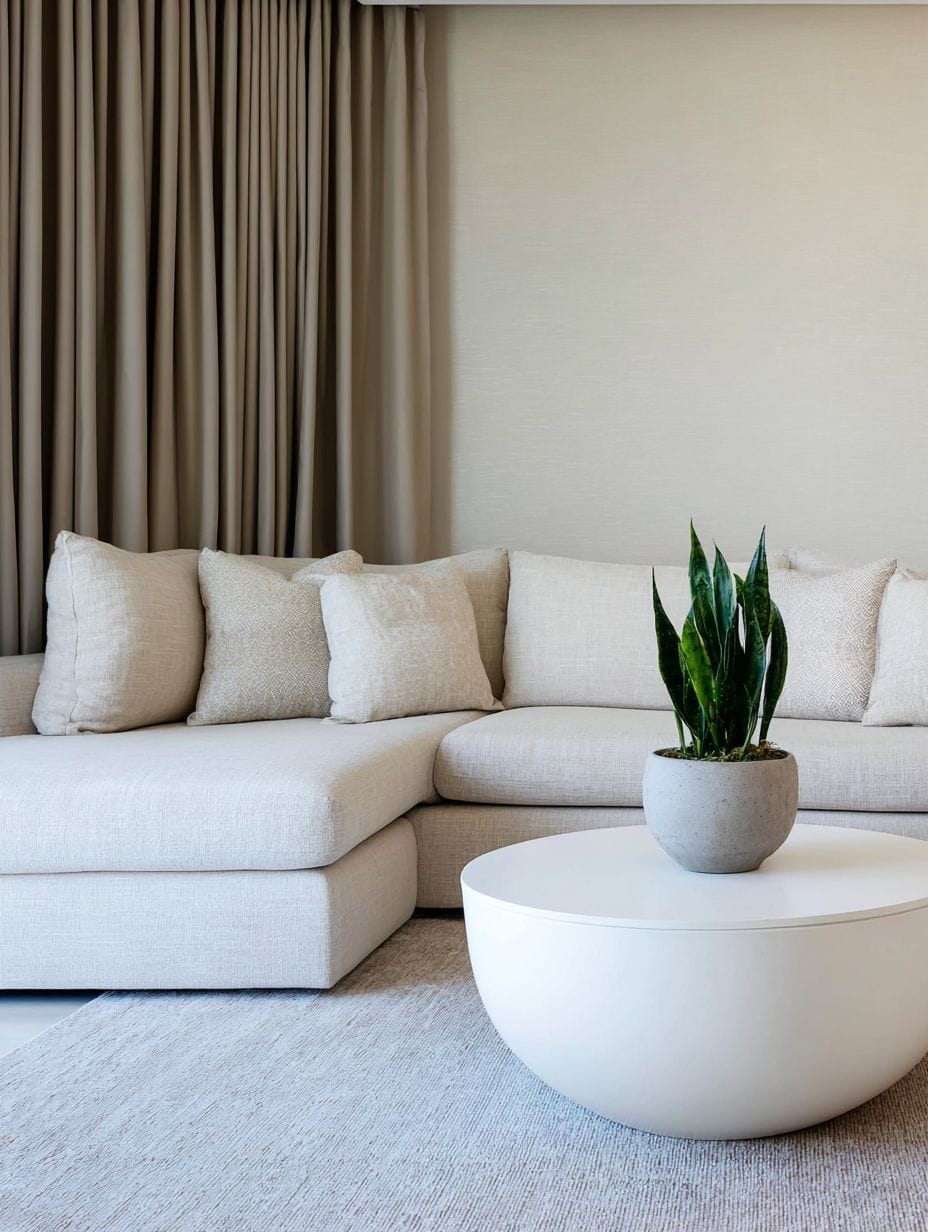 • Choose natural fabrics like linen for upholstery to add texture and warmth while maintaining a clean aesthetic