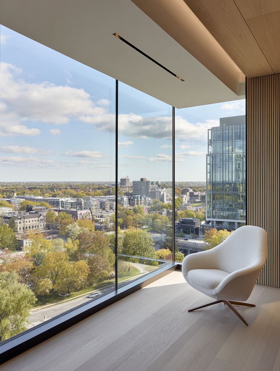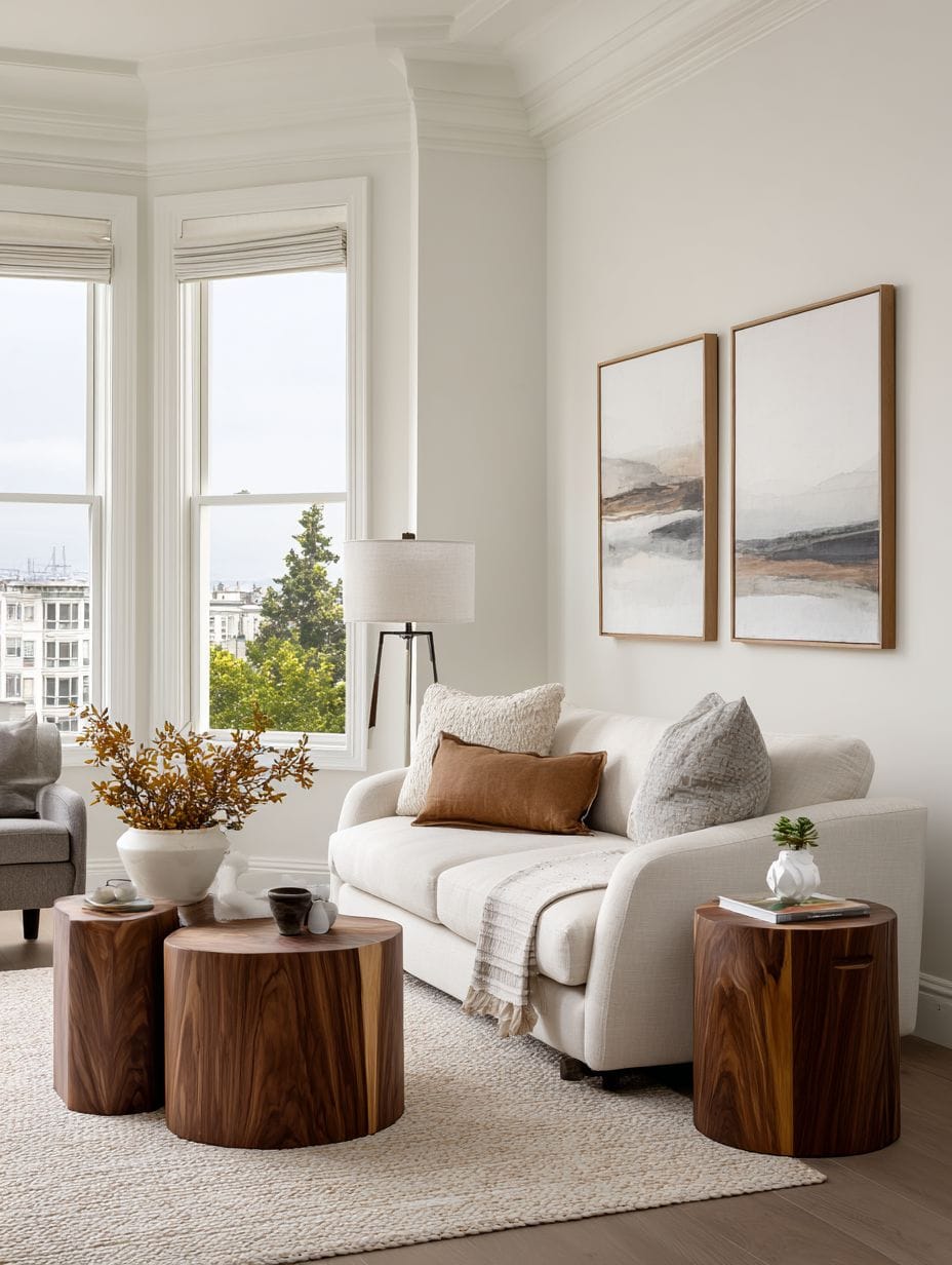 White walls and simple roller shades maintain a clean backdrop that allows the natural wood and textile textures to stand out without competing elements. The roller shades’ simple functionality and clean lines prevent window treatments from becoming decorative focal points, keeping attention on the carefully selected furniture and materials. This concept demonstrates that natural wood accents can add substantial warmth to minimalist spaces without requiring extensive use or abandoning neutral color schemes. By limiting wood to key furniture pieces and selecting a tone that complements the overall palette, the design achieves balance between minimalist restraint and inviting warmth. The result is a living room that feels both contemporary and timeless, sophisticated yet approachable.
