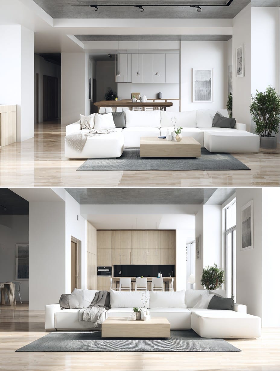 Open-plan living presents unique challenges for minimalist design, particularly in defining separate zones without visual barriers or clutter. This concept demonstrates how minimal furniture placement can create clear functional areas while maintaining the spacious, flowing quality that makes open plans appealing. A white sofa delineates the living area from the adjacent dining space without creating physical or visual barriers that would compromise the open feeling. The sofa’s placement creates an implicit boundary that organizes the space through position rather than through walls or dividers, allowing sight lines and light to flow freely throughout.