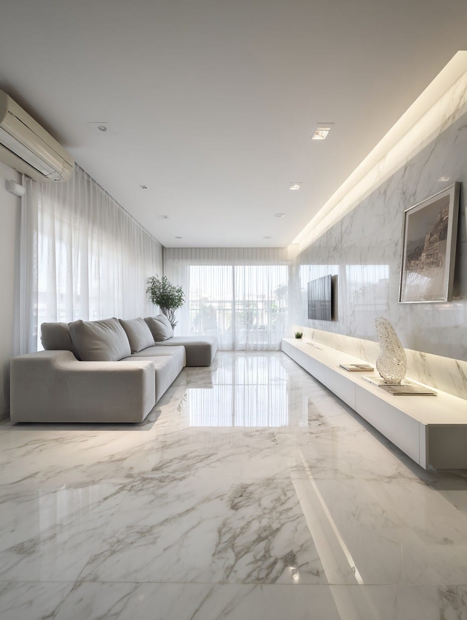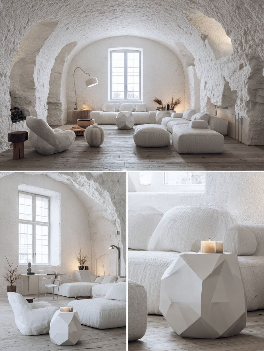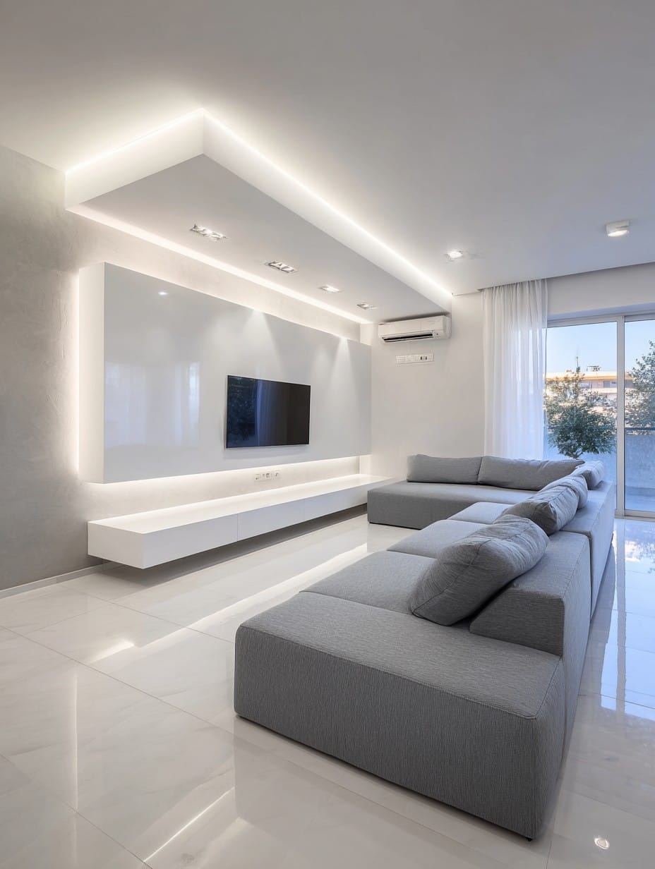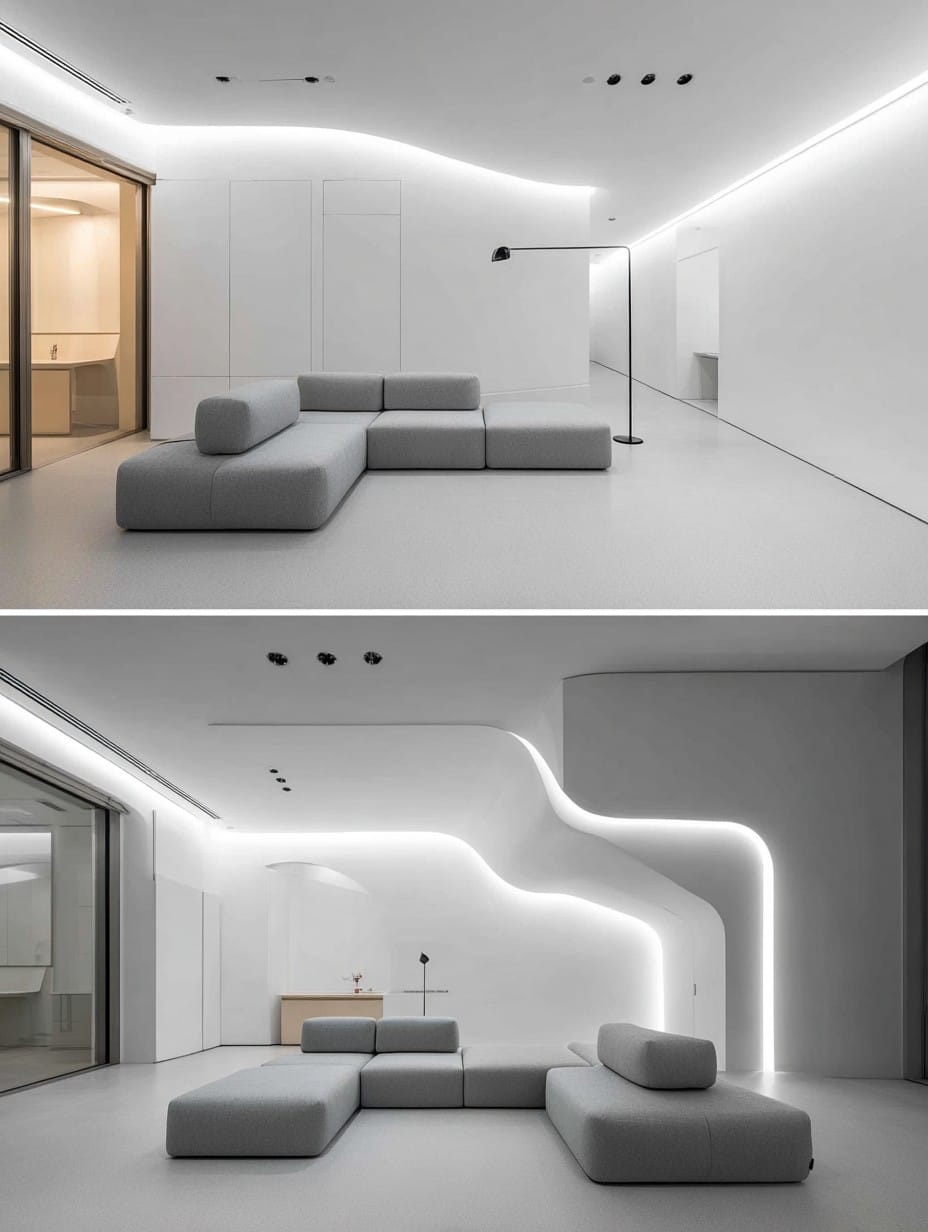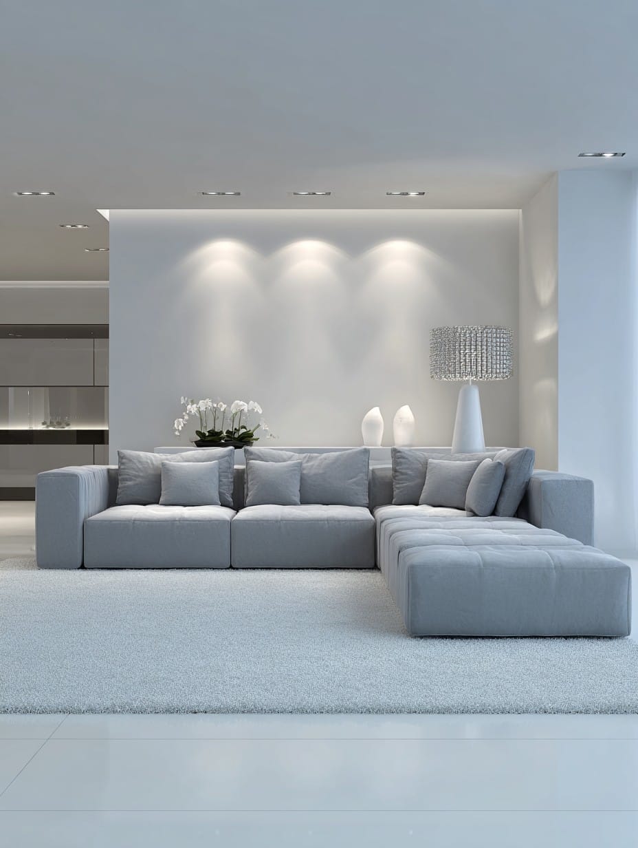 For those seeking the ultimate expression of minimalist tranquility, a monochromatic white scheme offers unparalleled serenity and spatial expansiveness. This concept demonstrates how a completely white palette can create visual interest through the layering of different textures and materials rather than through color variation. A low white platform sofa anchors the space with its horizontal emphasis, while its platform design creates a floating appearance that enhances the room’s airy quality. The sofa’s low profile also maximizes the perception of ceiling height, making the room feel more spacious.