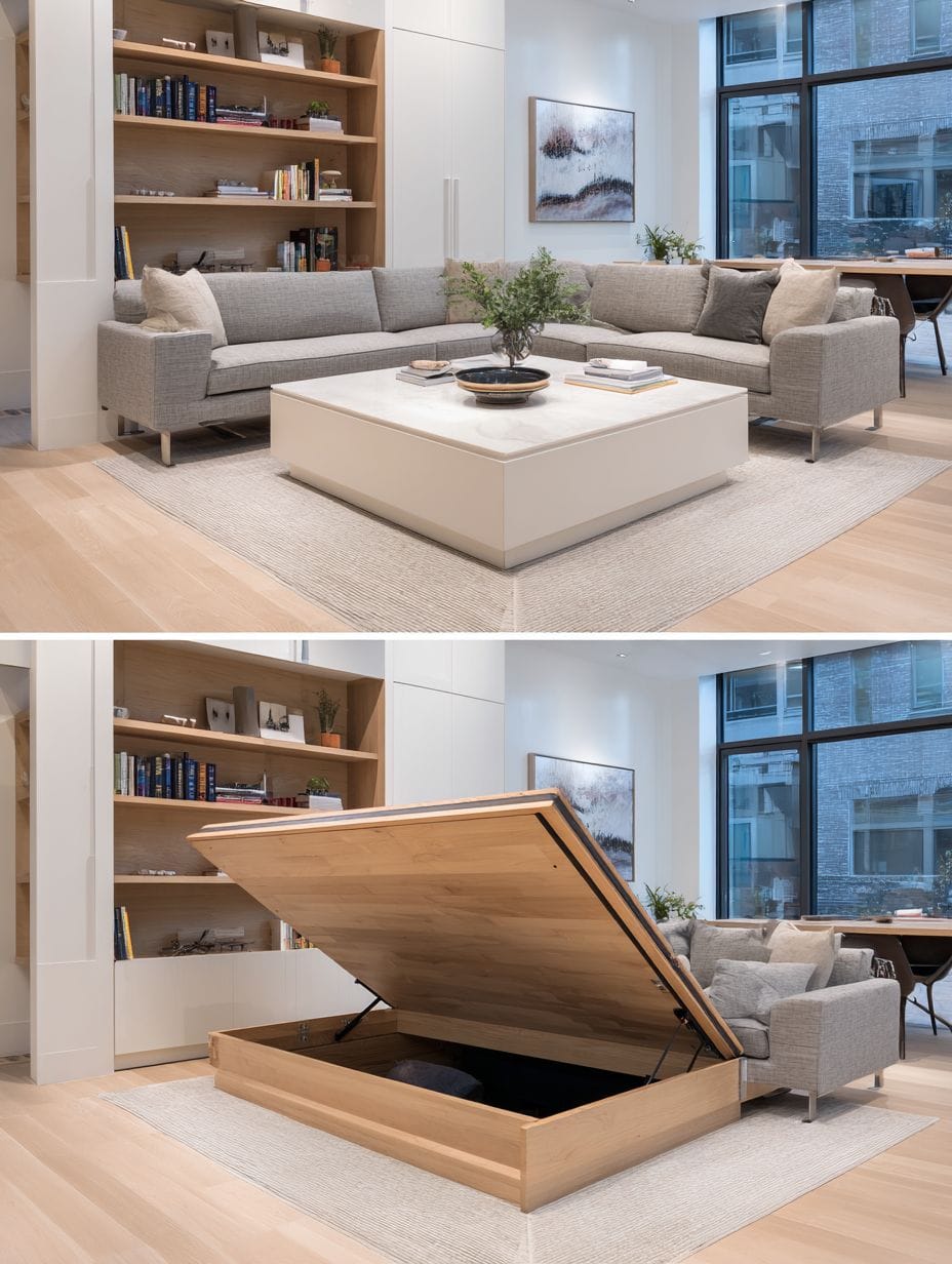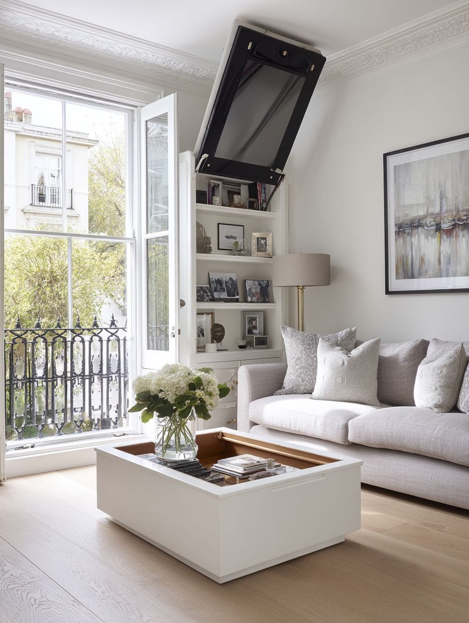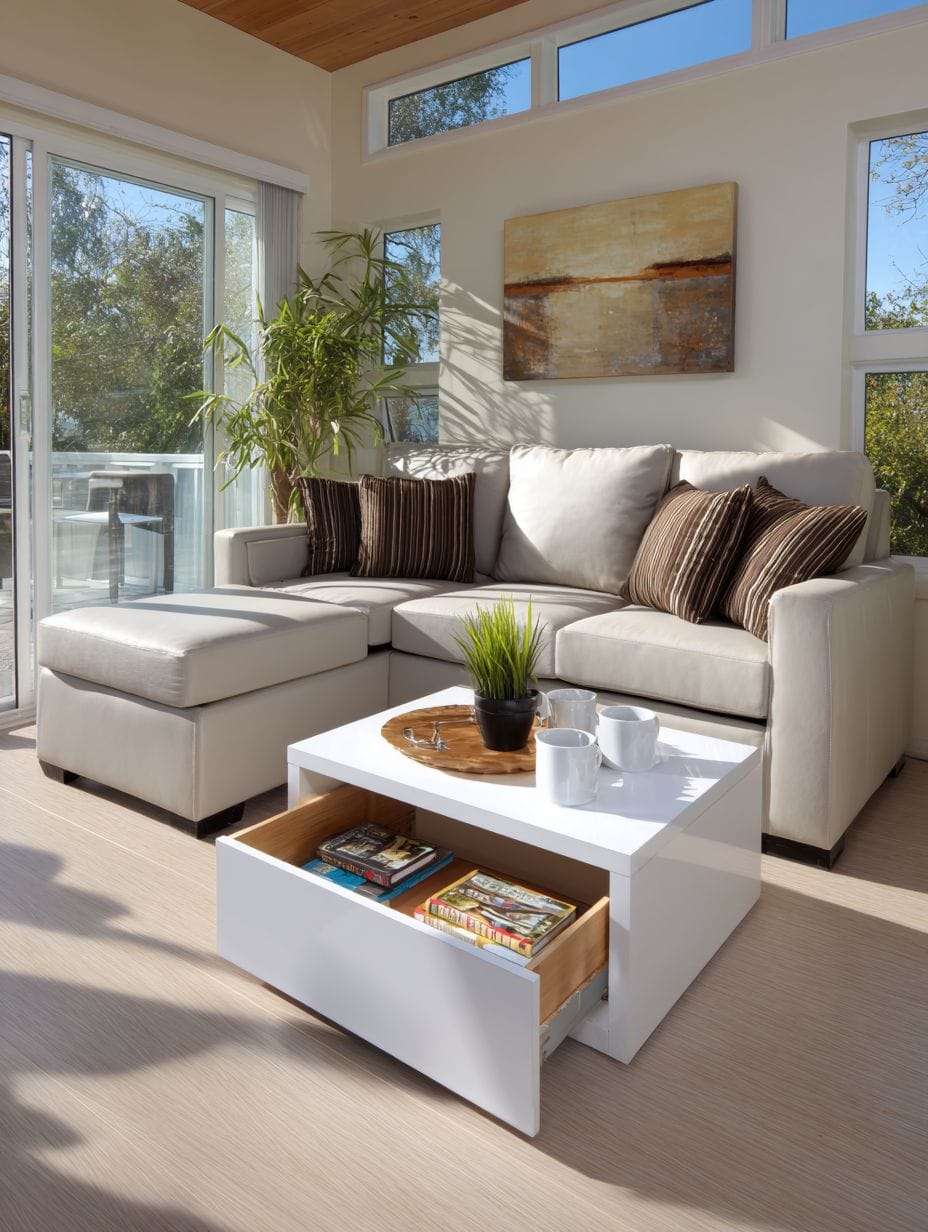 • Choose furniture with concealed storage to maintain clean lines while keeping everyday items accessible and organized