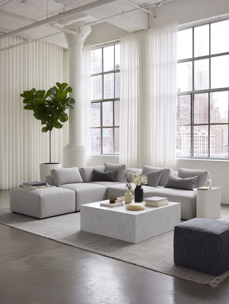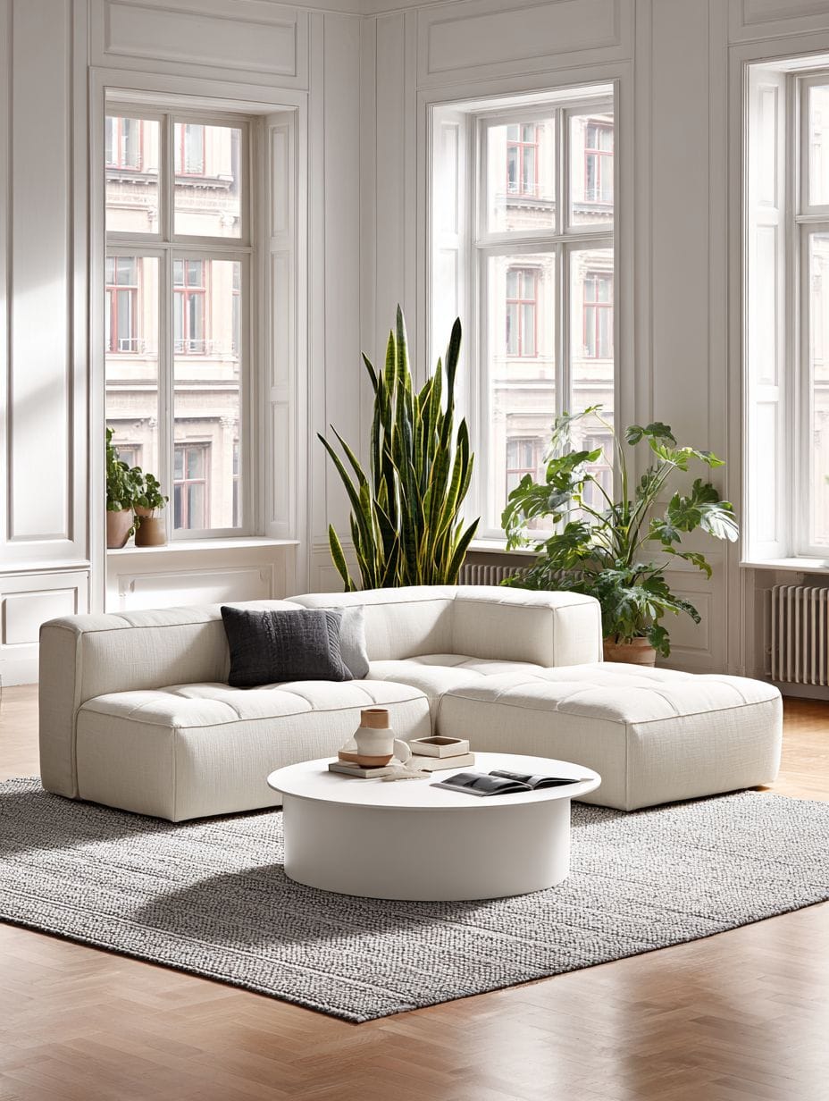 At the heart of the seating area sits a simple round white coffee table in matte finish, positioned on a textured wool area rug in pale grey. The circular shape of the table softens the angular lines of the modular seating while the matte finish prevents glare and maintains a sophisticated, understated appearance. The wool rug adds a crucial layer of warmth and comfort underfoot, demonstrating that minimalism doesn’t require sacrificing coziness. Its pale grey hue bridges the cream seating and white table, creating cohesion throughout the color scheme.