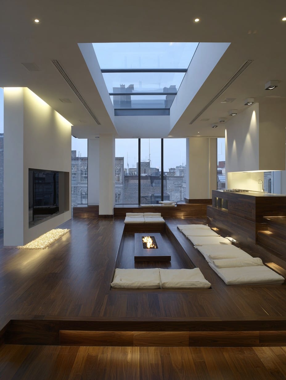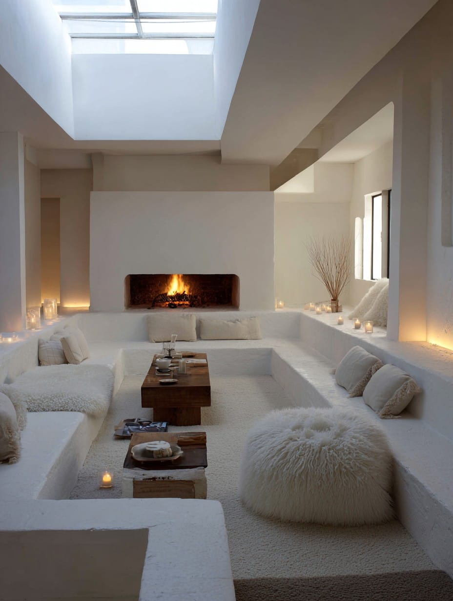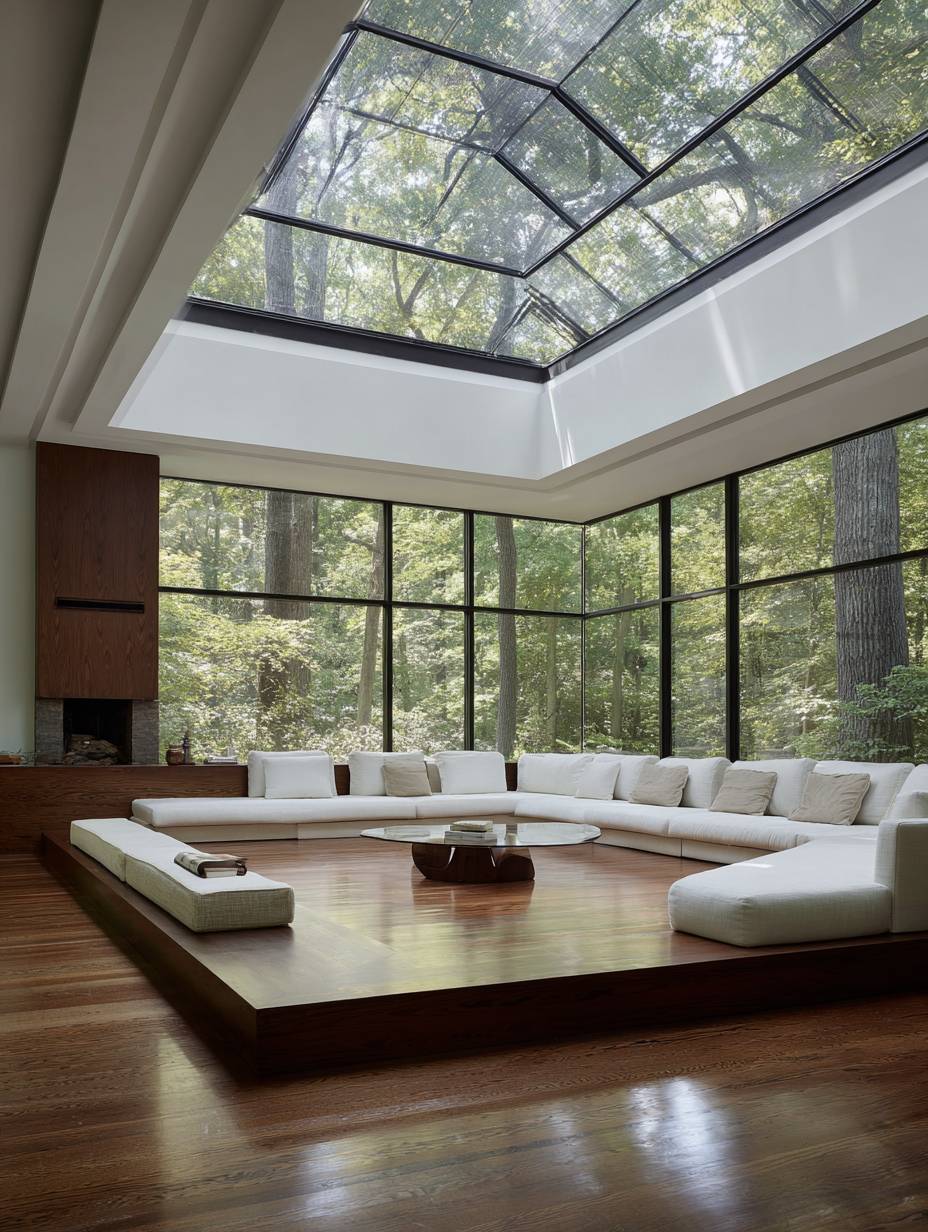 A large skylight provides natural illumination from above, bathing the conversation pit in soft, even light that changes throughout the day. The skylight’s placement directly above the seating area creates a connection to the sky and natural light cycles while maintaining privacy from surrounding structures. This concept illustrates that minimalist design reaches its highest expression when architecture itself provides function and beauty, reducing or eliminating the need for furnishings that can create clutter and visual complexity. The result is a living space that feels custom, permanent, and sophisticated—a true architectural solution rather than a decorated room. The conversation pit becomes the defining feature that gives the space unique identity and purpose.
