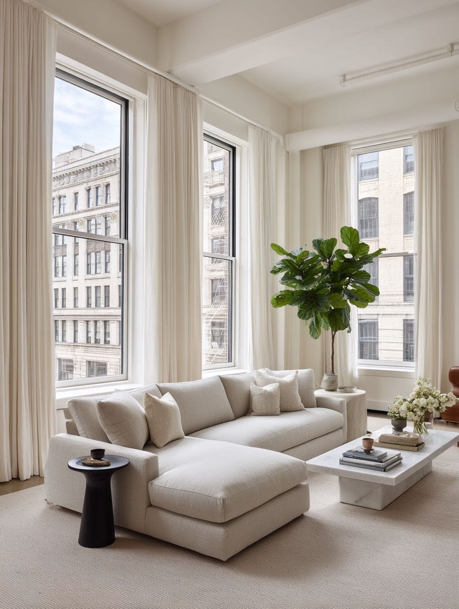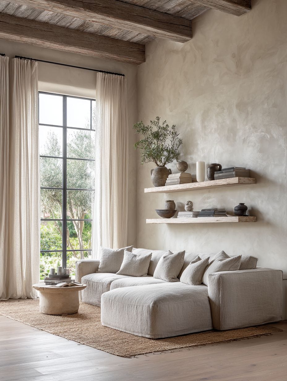 Large windows with sheer linen curtains allow soft natural light to illuminate the textured walls in warm white, creating a gentle, diffused quality that enhances the room’s serene atmosphere. The linen curtains filter harsh direct sunlight while maintaining privacy and adding another layer of natural texture to the scheme. This approach to neutral layering proves that minimalist spaces can feel warm and inviting through thoughtful selection of materials and tones within a restrained palette. The result is a living room that feels calm and soothing rather than stark or cold, demonstrating minimalism’s potential for creating truly comfortable, livable spaces.