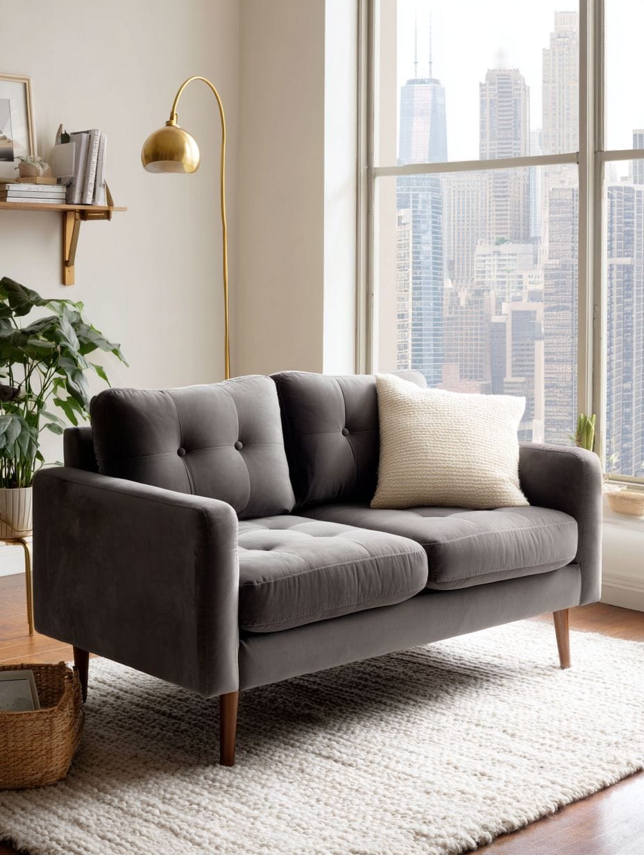 Urban living often presents spatial challenges that minimalist design is uniquely equipped to address. This concept demonstrates how thoughtful minimalism can maximize both function and perceived spaciousness in compact apartments. A streamlined grey velvet loveseat against white walls provides comfortable seating while its compact scale and low profile prevent the furniture from overwhelming the limited square footage. The velvet upholstery introduces subtle luxury and visual richness through its characteristic light-reflective qualities, proving that small spaces can incorporate sophisticated materials without feeling cramped.