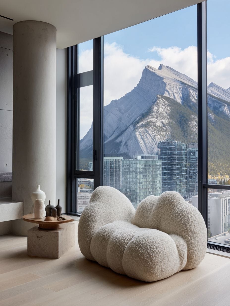 Natural light from adjacent windows illuminates the space evenly, preventing harsh shadows that might interfere with viewing the artwork while providing ambient illumination that changes throughout the day. The even lighting allows the photograph to be appreciated properly at any time, while the natural light’s subtle variations prevent the space from feeling static or artificially controlled. This concept proves that minimalist spaces can celebrate art and creativity while maintaining restraint in other areas, creating gallery-like environments that honor individual pieces through the discipline of limited selection. The result is a living room that functions as both comfortable living space and contemplative art gallery.