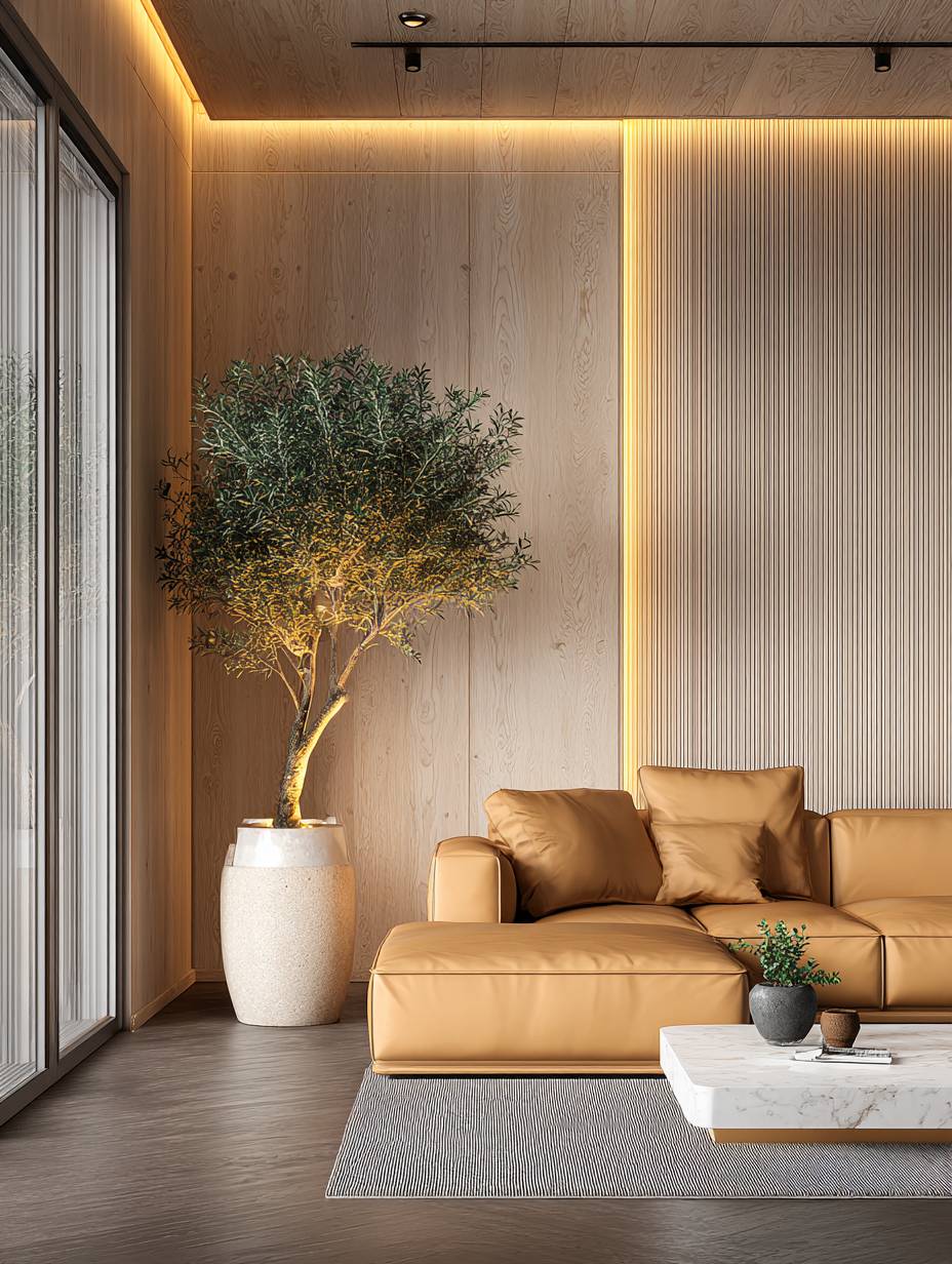 The intersection of Japanese design principles and Western minimalism creates living spaces of profound tranquility and purposeful simplicity. This concept features low wooden bench seating in natural finish with simple cotton cushions in off-white, embodying the Japanese aesthetic of bringing nature indoors through unprocessed materials. The low seating arrangement encourages a different perspective on the space, literally lowering the eye level and creating a more grounded, meditative relationship with the room. The natural wood finish celebrates the material’s inherent beauty, with visible grain patterns and natural color variations providing all the decoration needed.