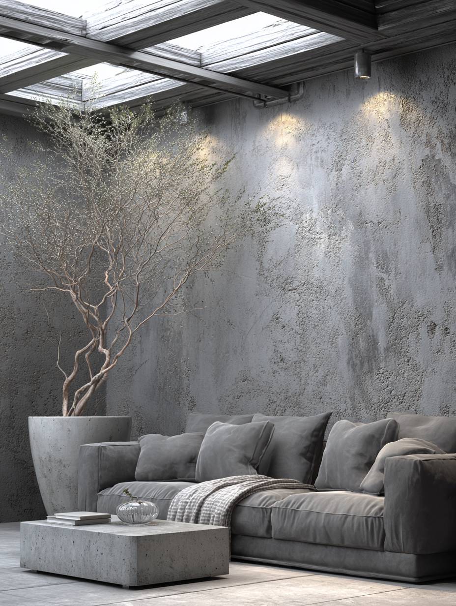 The marriage of industrial aesthetics and minimalist principles creates living spaces of striking sophistication and urban edge. This concept features exposed concrete walls and polished concrete floors that celebrate the raw, unfinished beauty of structural materials typically hidden behind drywall and flooring. The concrete’s natural variations in tone and texture provide visual interest without requiring additional decoration, while its cool grey tones create a neutral backdrop that feels both modern and timeless. The polished floor finish reflects light and creates a subtle sheen that elevates the industrial material from construction grade to design element.