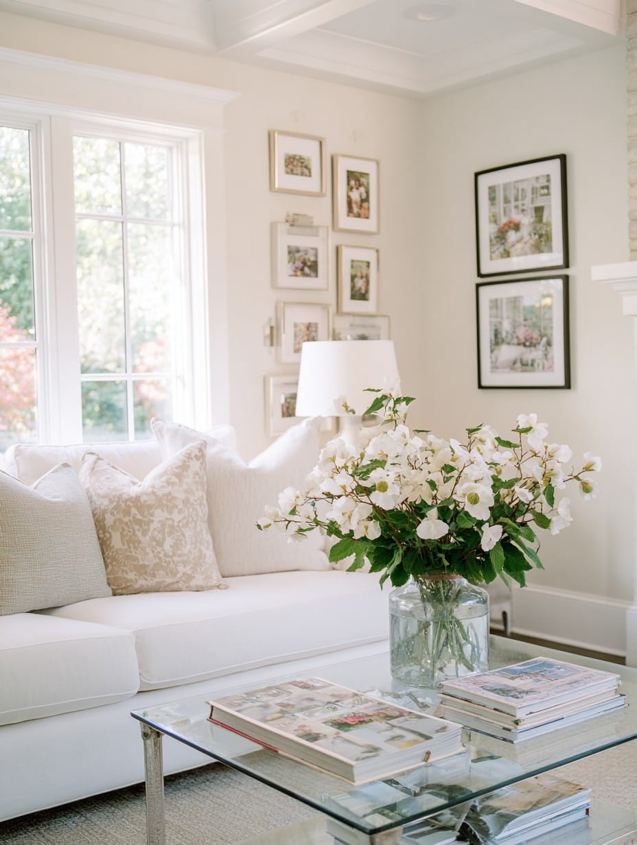 • Select one piece in a contrasting tone like a darker sofa to anchor the space and prevent a washed-out appearance