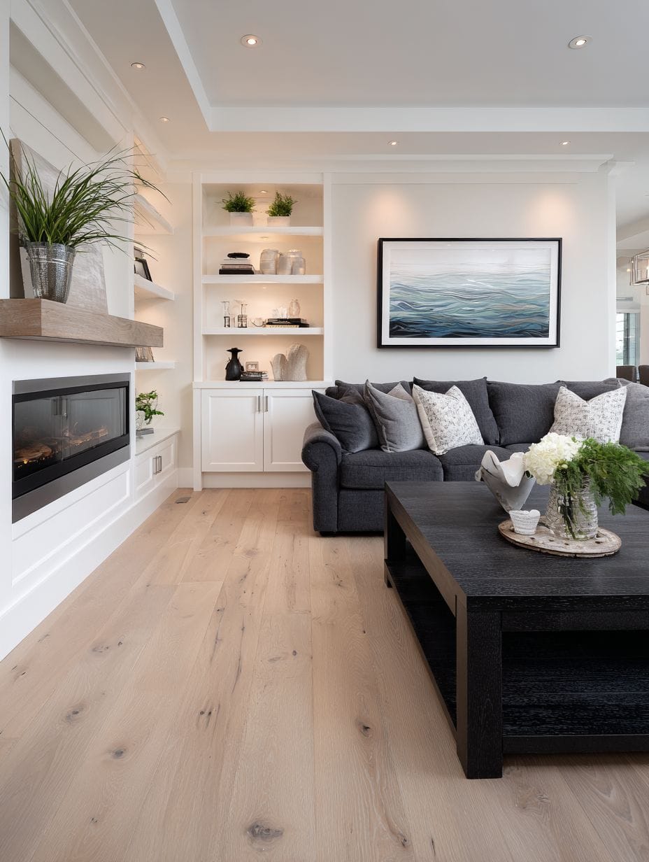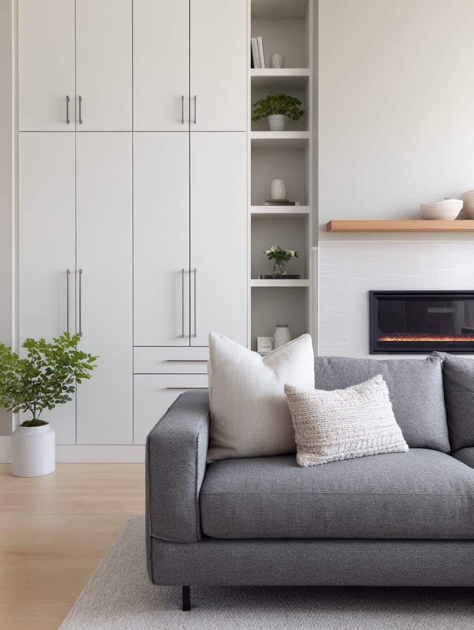 A streamlined charcoal grey sofa provides a sophisticated contrast to the white storage units, grounding the space with its deeper tone while maintaining the minimalist emphasis on clean lines and simple forms. The sofa faces a recessed electric fireplace with a simple white surround, offering ambiance and warmth without the visual complexity of a traditional fireplace with mantel and decorative elements. The recessed installation keeps the wall plane smooth and uninterrupted, preserving the room’s serene, uncluttered character even while incorporating this cozy feature.