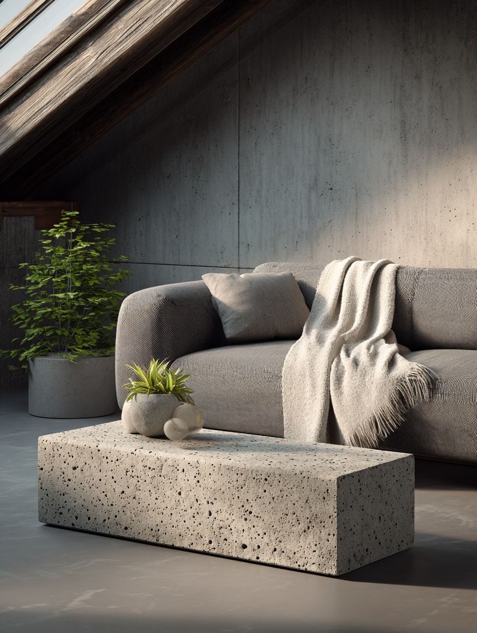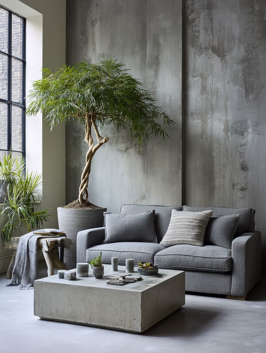 A concrete coffee table with visible aggregate texture brings industrial sophistication to the grey palette, its raw material and rough surface contrasting with the softer textile elements. The concrete’s natural variations in tone and the varied sizes of exposed aggregate create visual interest without introducing pattern or decoration. The table’s substantial presence and honest material expression ground the lighter, softer elements around it, preventing the scheme from feeling too delicate or insubstantial. A single architectural plant in a concrete planter continues the material dialogue while introducing living greenery that adds vitality to the monochromatic scheme.
