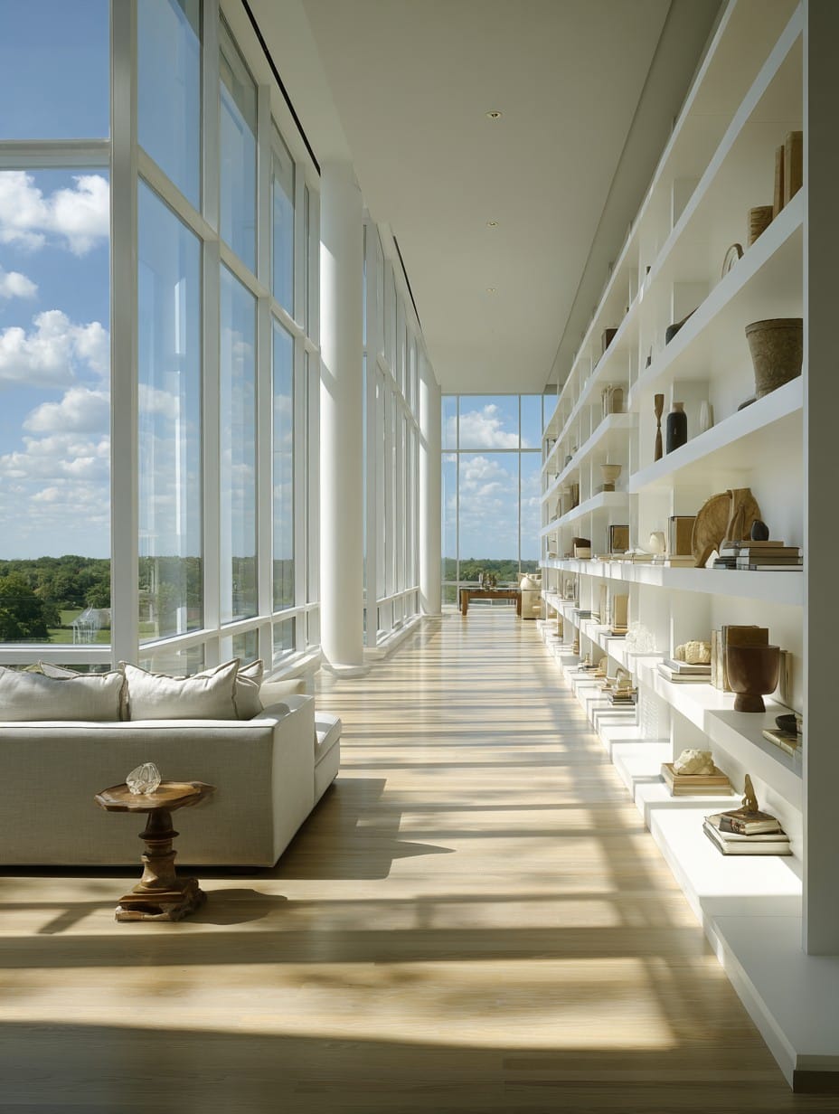 Minimalism doesn’t require eliminating all decorative objects—rather, it demands thoughtful curation and intentional display. This concept demonstrates how floor-to-ceiling white built-in shelving can showcase carefully selected objects while maintaining minimalist principles through generous spacing between items. The vertical emphasis of the shelving draws the eye upward, making the room feel taller while providing ample display space without consuming valuable floor area. The white finish ensures the shelving blends seamlessly with the walls, allowing the displayed objects to take visual precedence.
