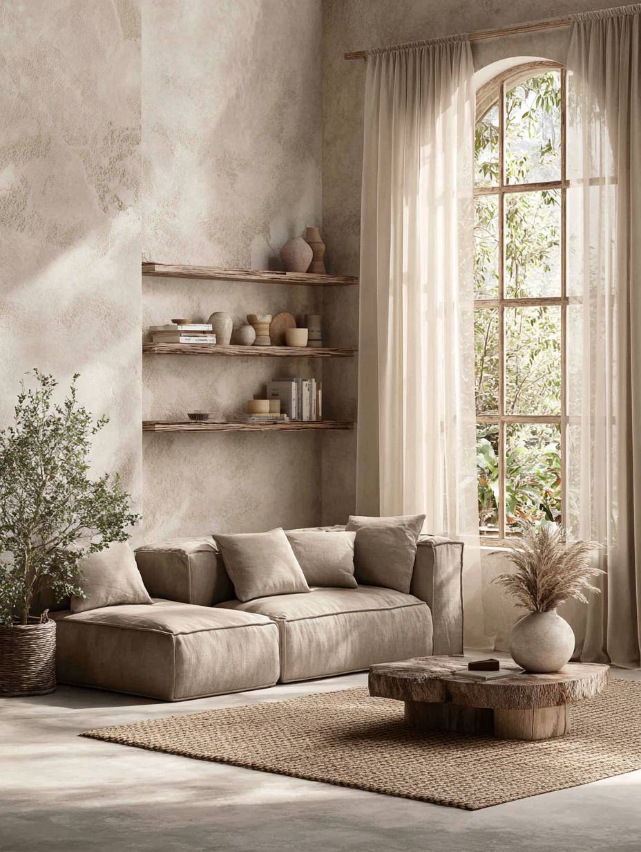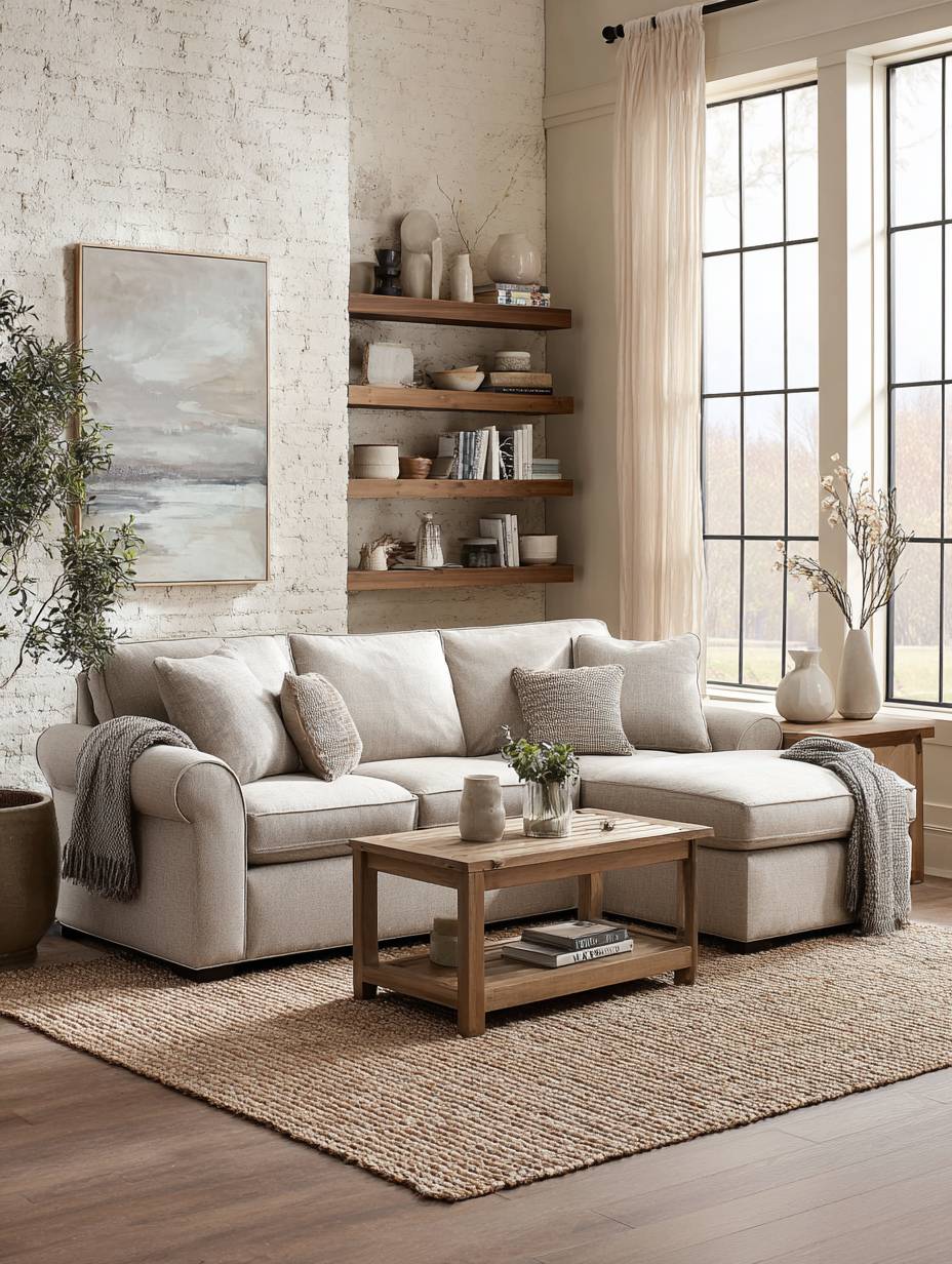 Creating warmth within a neutral palette requires skillful layering of different tones and textures, as this concept beautifully demonstrates. A beige linen sectional sofa provides a foundation of comfortable, inviting seating while its natural fabric introduces subtle texture and organic appeal. The beige tone is warmer than grey alternatives, creating a more welcoming atmosphere while maintaining the versatility and timelessness of neutral colors. Beneath the sofa, a natural jute area rug adds another layer of neutral warmth, its woven texture providing visual and tactile interest while reinforcing the room’s connection to natural materials.