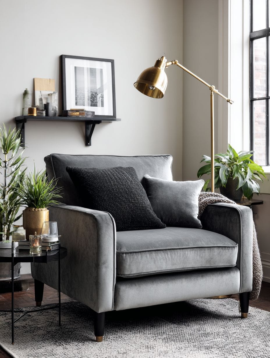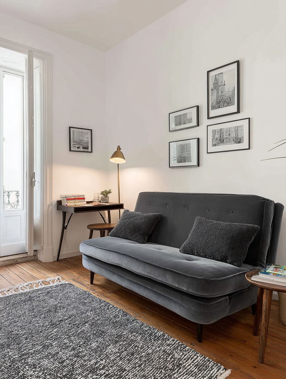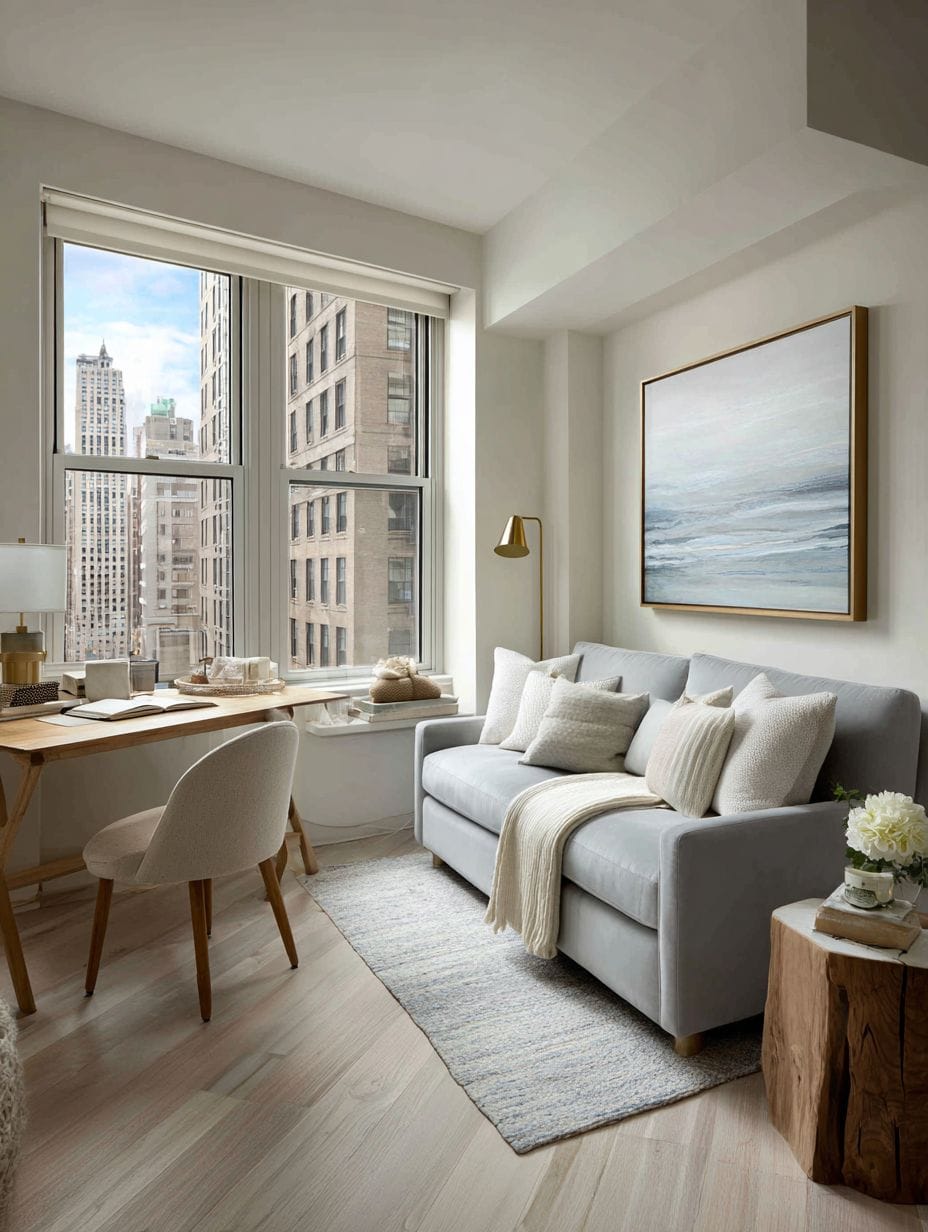 A single brass floor lamp provides task lighting with a warm metallic accent that elevates the simple scheme without requiring surface space that a table lamp would demand. The brass finish adds a touch of elegance and visual warmth against the cool grey and white palette. This concept illustrates that minimalism is particularly valuable in small spaces where every item must justify its presence through beauty, function, or ideally both. The result is a compact urban living room that feels open, organized, and surprisingly spacious despite its actual dimensions.