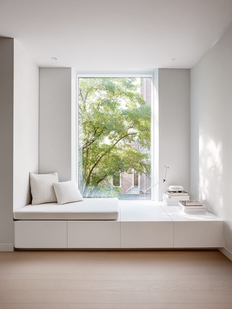 A large window with a bamboo shade allows filtered natural light to enter the space, creating gentle patterns that shift throughout the day and connect the interior to natural cycles. The bamboo material echoes the natural wood of the bench seating, creating material continuity throughout the design. This zen-like approach demonstrates that minimalism reaches its highest expression when it facilitates a connection to nature and encourages mindful presence. The space invites contemplation and calm, proving that minimalist living rooms can serve as sanctuaries from the hectic pace of modern life.