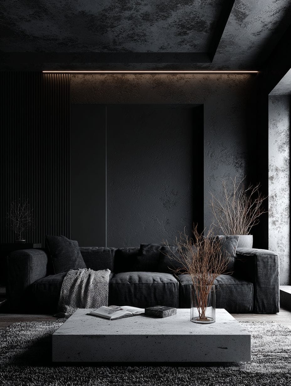 A black leather sofa with clean lines provides a luxurious contrast to the rough concrete surfaces, its smooth, refined material juxtaposed against the textured walls. The black color grounds the space and creates strong visual definition against the grey concrete, while the leather’s natural patina will develop character over time, aligning with the industrial aesthetic’s appreciation for materials that age gracefully. A simple steel and glass coffee table continues the industrial material palette while maintaining transparency that doesn’t obstruct sight lines or make the space feel heavy.