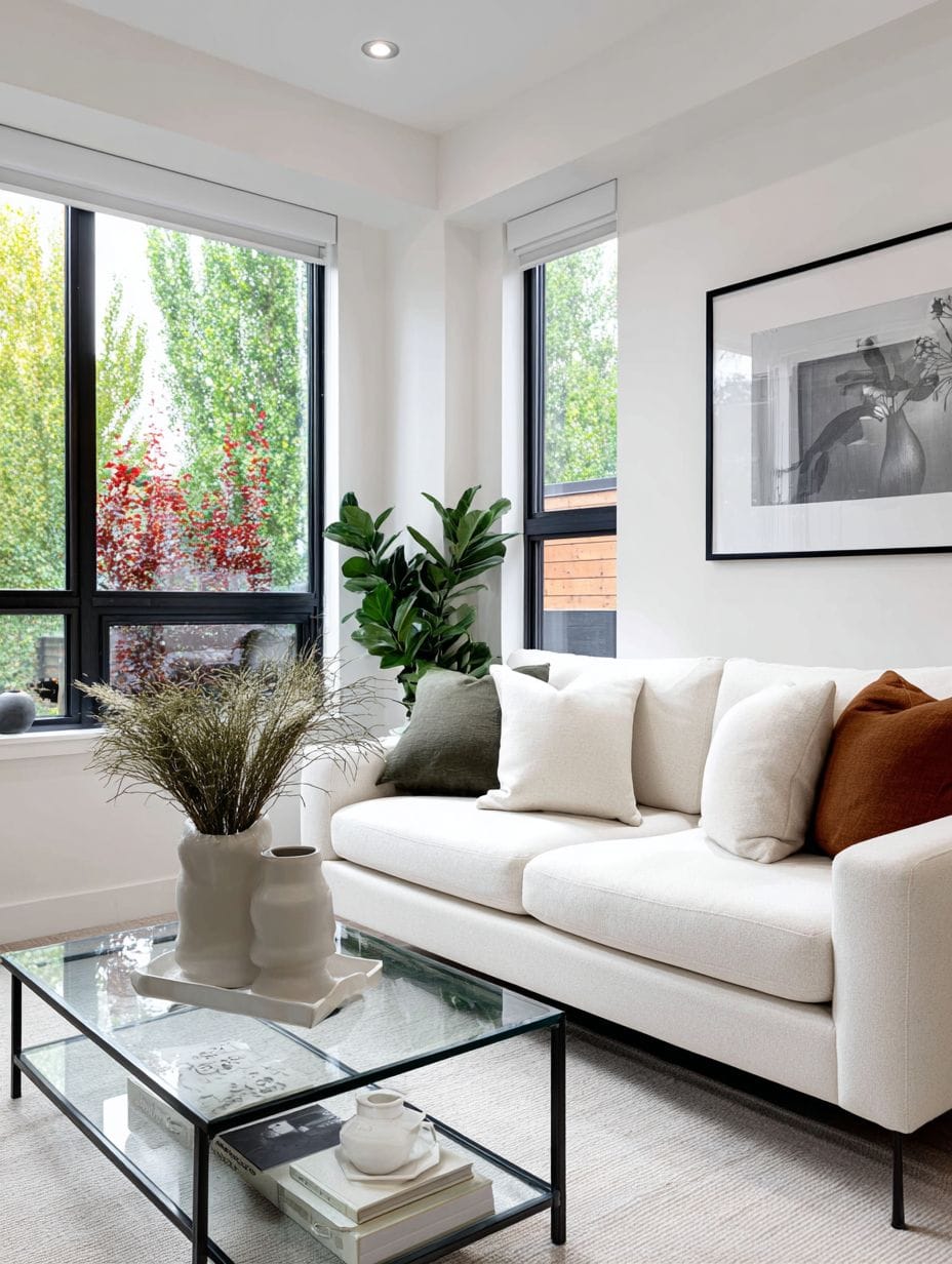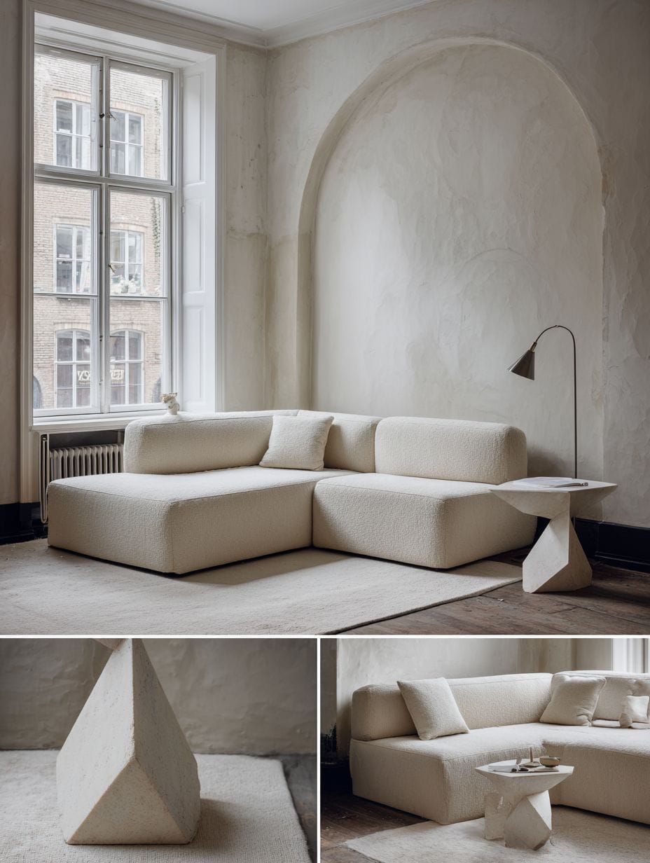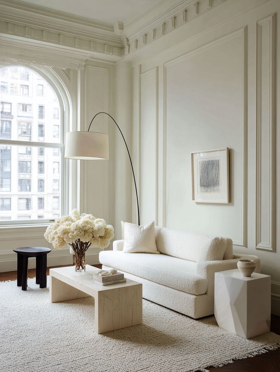 A geometric white side table and single arc floor lamp in brushed steel provide the only variations from the white scheme, with the lamp’s metallic finish introducing a subtle reflective quality that catches and disperses light throughout the space. The arc design of the floor lamp is particularly well-suited to minimalist interiors because it provides overhead lighting without requiring ceiling installation, maintaining the ceiling’s clean, uninterrupted appearance. The geometric side table’s angular form contrasts with the sofa’s softer cushions, creating visual interest through shape rather than color.