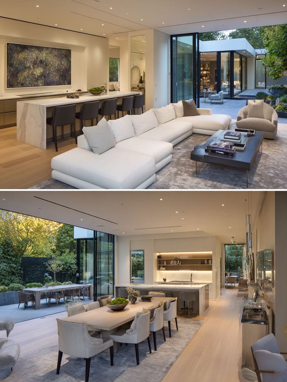 The architectural feature transforms what could be a ordinary seating arrangement into a sophisticated, permanent element that gives the room distinctive character and purpose. Built-in seating eliminates the need for sofas or chairs, reducing visual clutter while actually increasing seating capacity compared to conventional furniture arrangements. The white upholstery maintains the minimalist aesthetic while providing a clean, cohesive appearance that would be difficult to achieve with multiple separate furniture pieces. The pit’s square or circular configuration encourages face-to-face interaction in ways that traditional furniture arrangements often cannot.