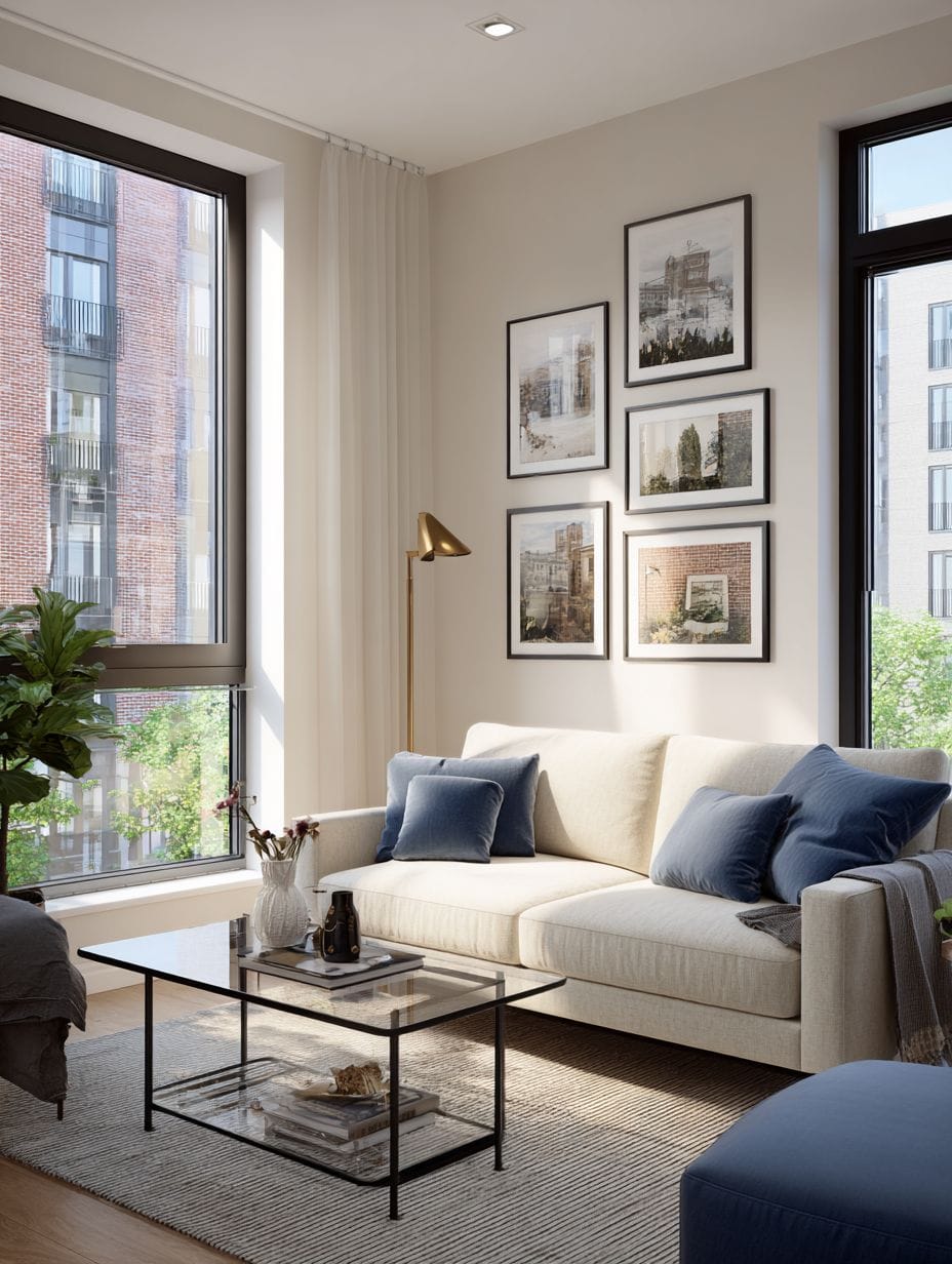 • Select minimal furniture in neutral tones that recedes visually to keep focus on featured art