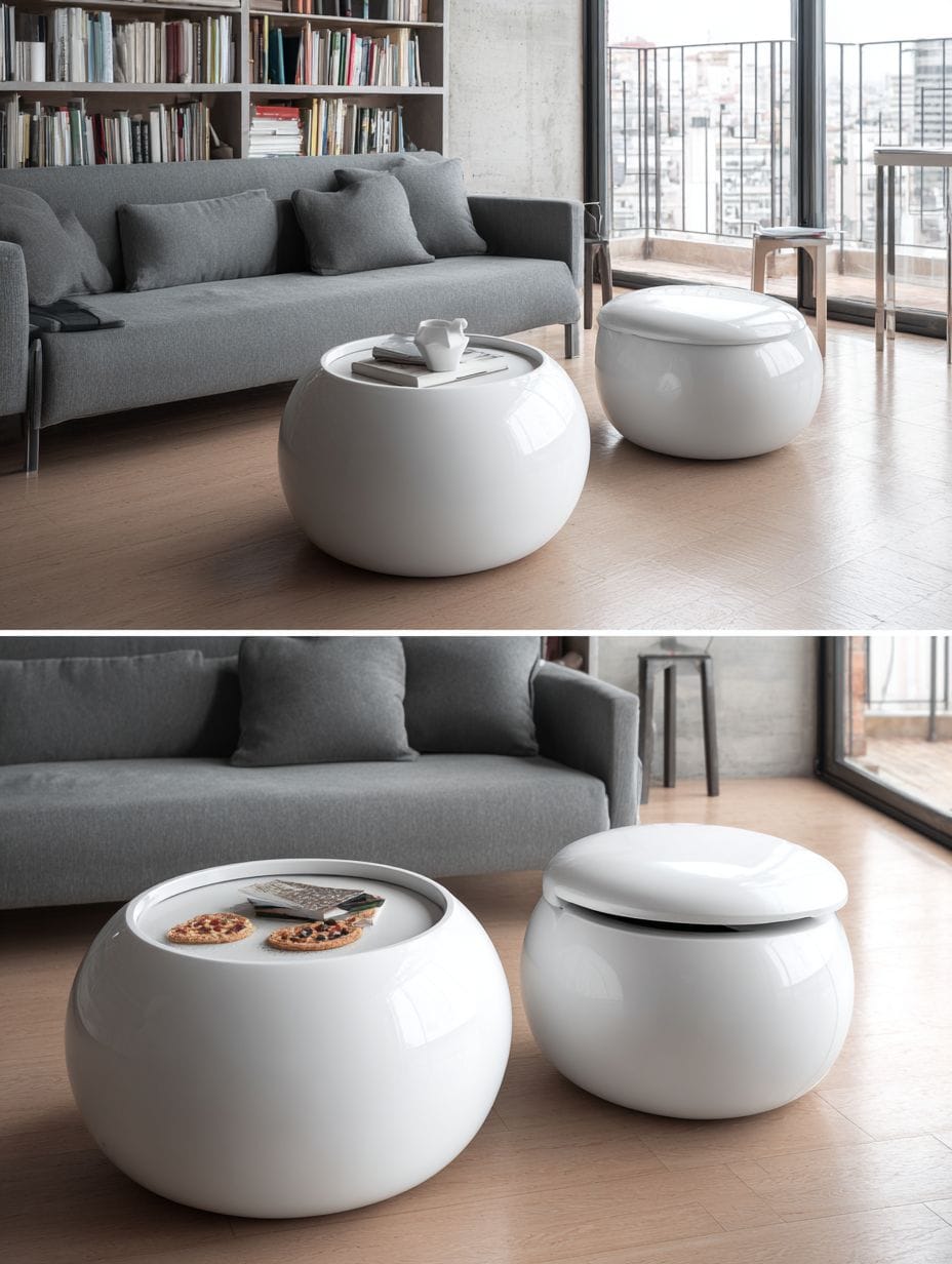 The ultimate expression of minimalist efficiency comes through multifunctional furniture that serves multiple purposes while maintaining clean aesthetic lines. This concept demonstrates a capsule furniture approach where each piece fulfills several functions, maximizing utility while minimizing the number of items in the space. A white lacquered storage ottoman serves simultaneously as a coffee table for beverages and books, concealed storage for items that would otherwise require visible cabinets or shelves, and occasional additional seating when needed. The white lacquered finish creates a sophisticated, contemporary appearance while hiding fingerprints and wear better than matte surfaces.