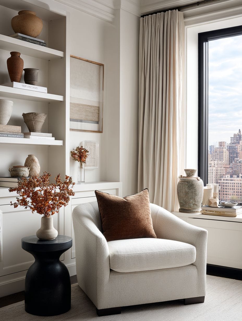 • Display ceramics in neutral tones to add sculptural interest while maintaining color restraint