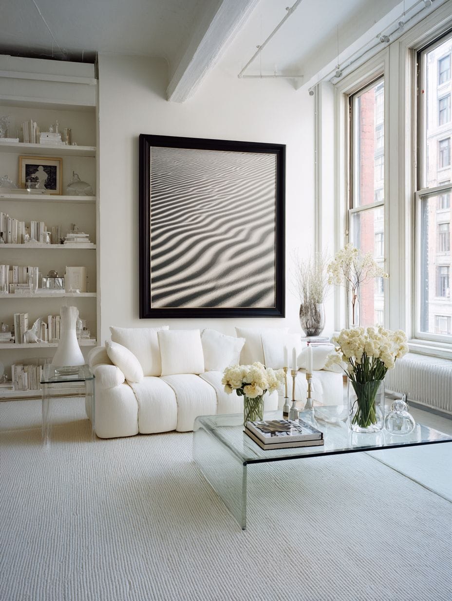 A simple white sofa and glass coffee table keep focus directed toward the statement piece, their neutral colors and minimal forms receding to allow the artwork to dominate the visual landscape. The white sofa’s clean lines and lack of decorative details ensure it doesn’t compete with the photograph for attention, while the glass coffee table’s transparency maintains sight lines and creates an almost invisible functional surface. This furniture restraint demonstrates the minimalist principle that not every element in a room must demand attention—some pieces serve best by supporting rather than competing.