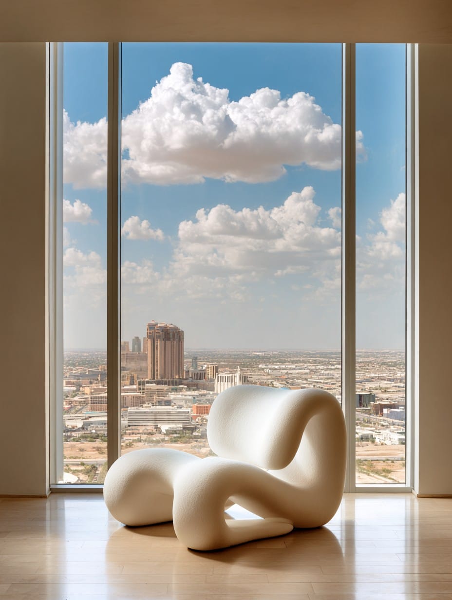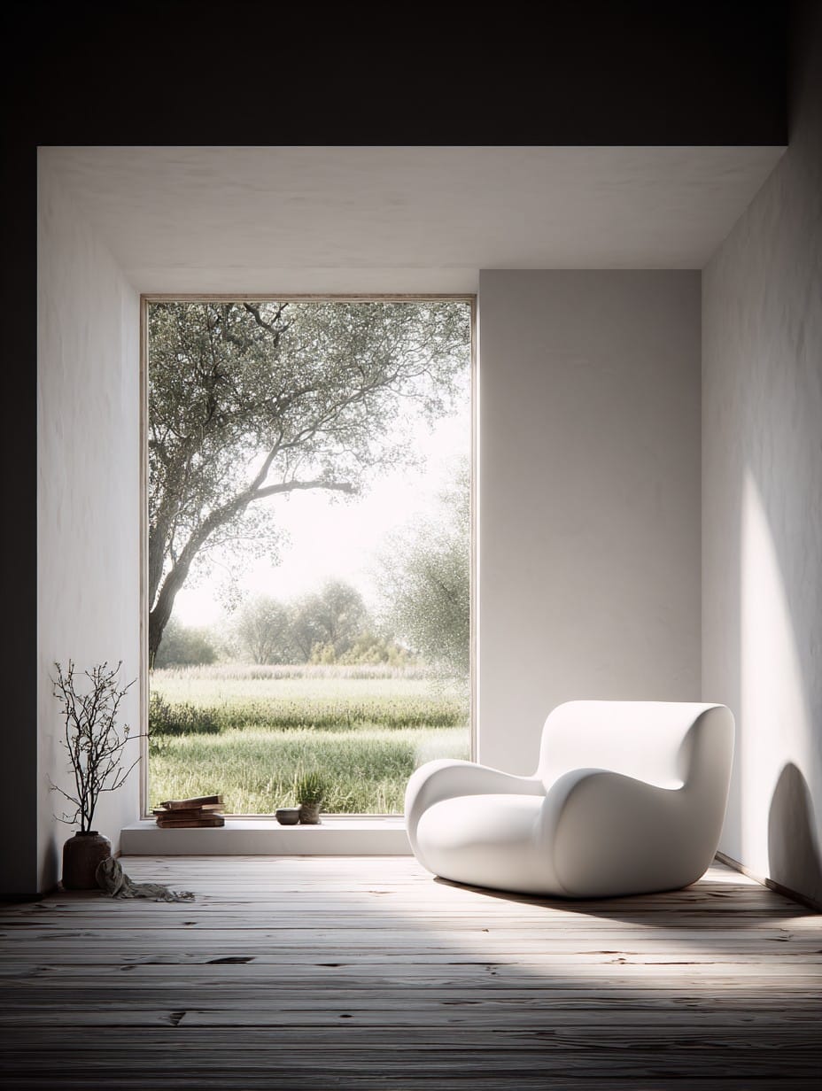 Art can play a central role in minimalist spaces when selected and displayed with appropriate restraint, as this concept demonstrates. A single large-scale photograph in a simple black frame against a white wall serves as the room’s only artwork, its substantial size and powerful imagery creating impact without requiring multiple pieces. The gallery approach of displaying one significant work rather than multiple smaller pieces allows the artwork to be truly seen and appreciated rather than competing for attention within a crowded arrangement. The black frame provides definition without ornate decoration, its simple profile complementing rather than distracting from the image.