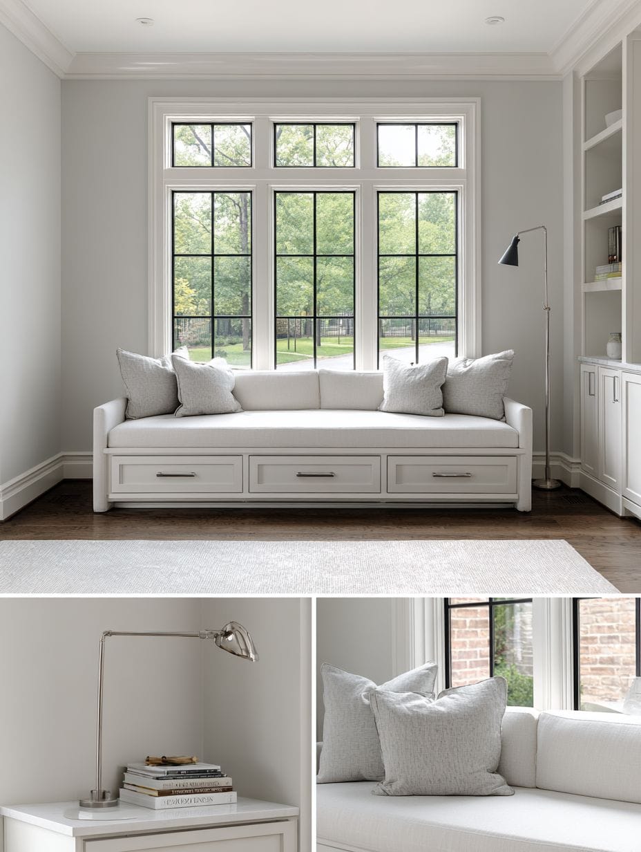 A simple grey linen loveseat is positioned to allow enjoyment of both the window view and the curated display, creating a comfortable vantage point for appreciating the room’s elements. The loveseat’s compact scale is appropriate for the viewing-focused layout, providing seating without overwhelming the space or blocking sight lines to the shelving. The grey linen introduces subtle texture and a neutral mid-tone that grounds the white-dominated scheme, preventing the space from feeling too light or insubstantial.