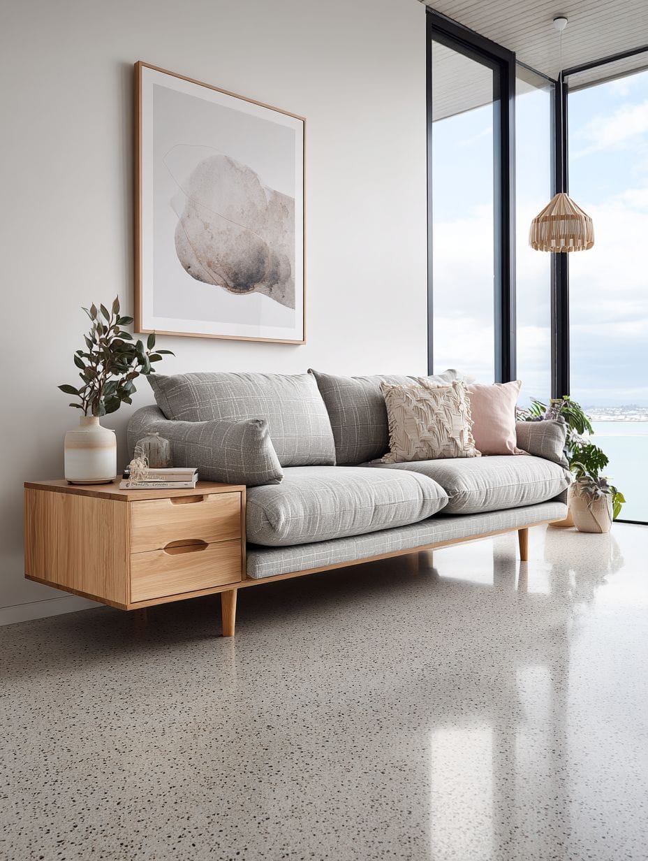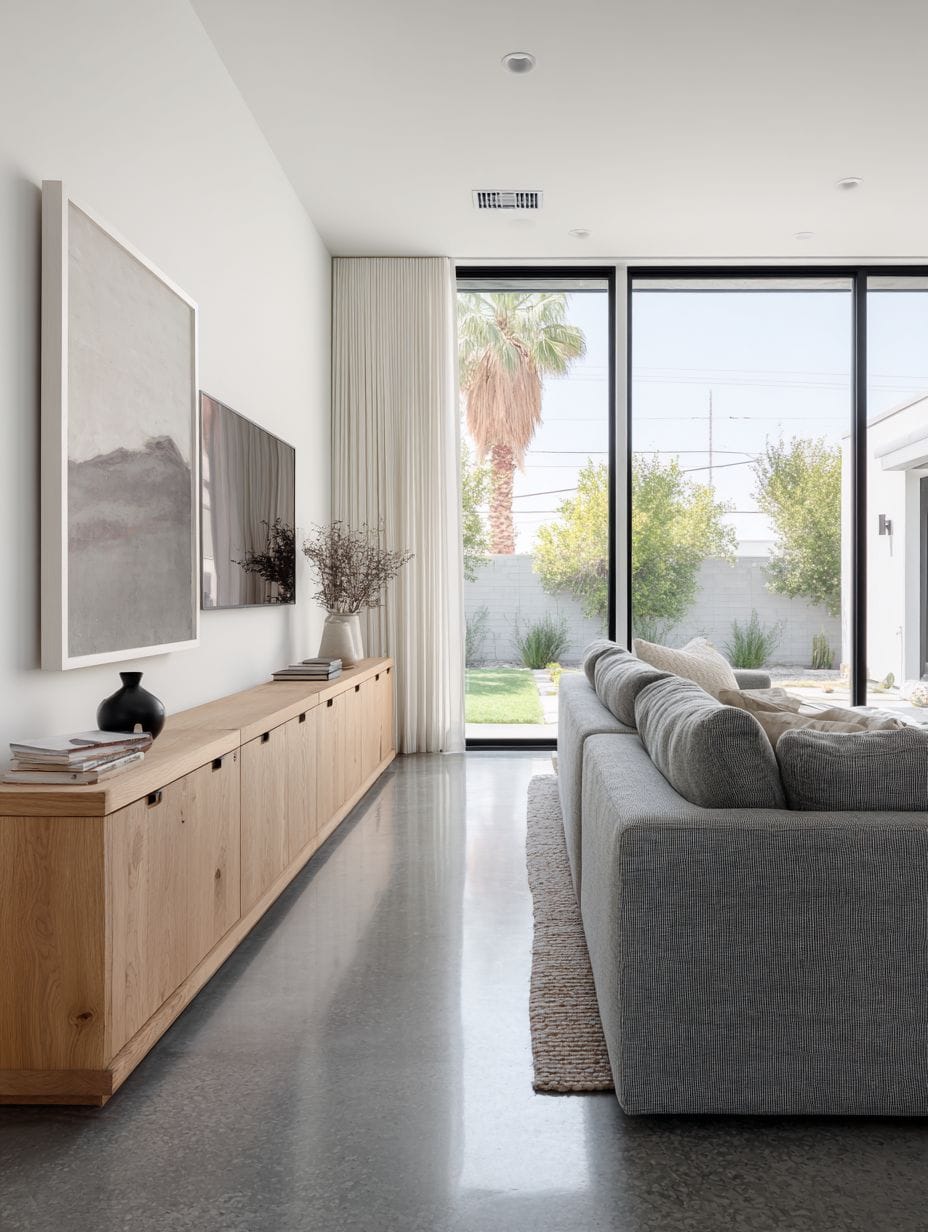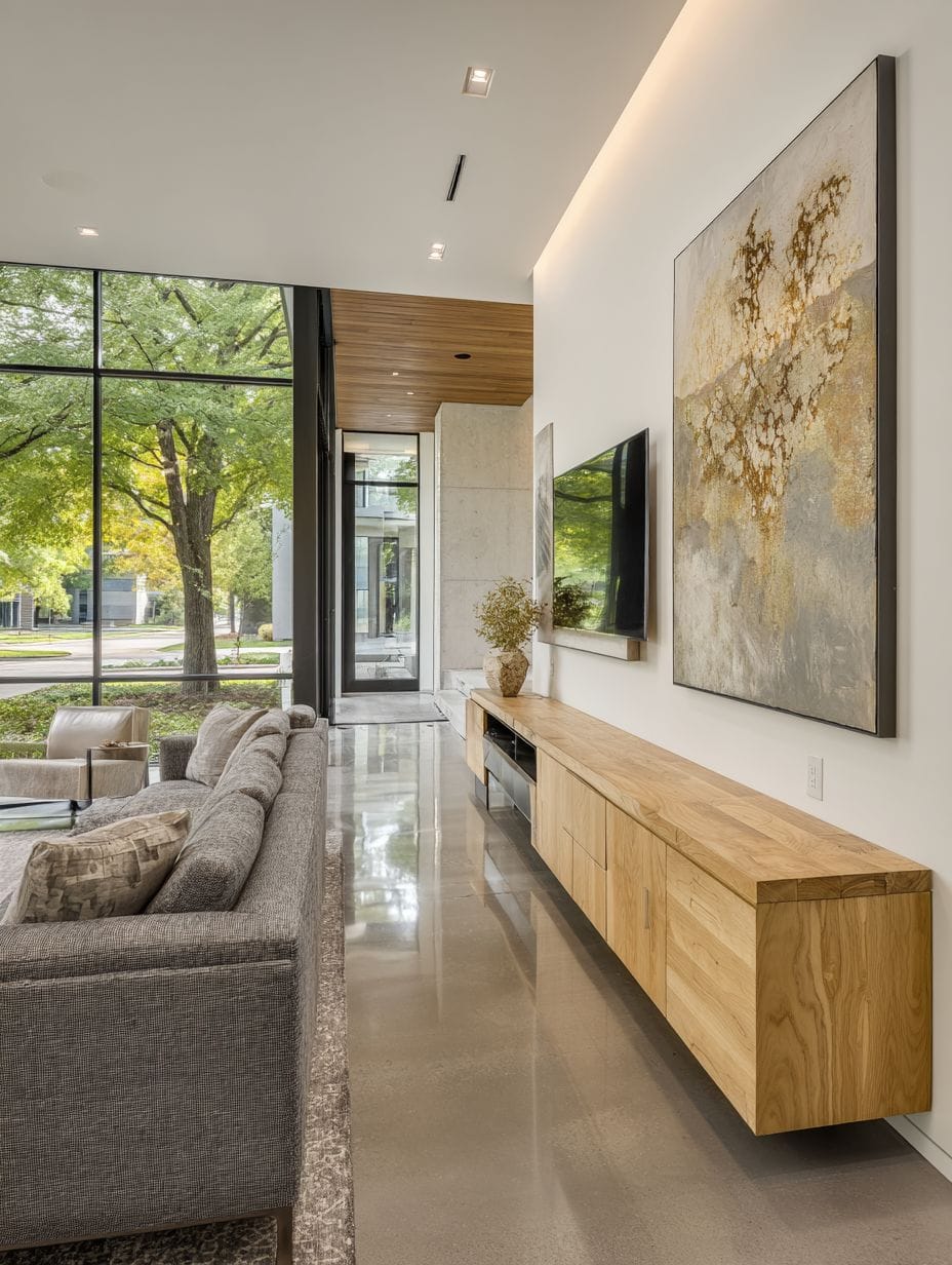 A natural oak floating media console demonstrates how functional storage can enhance rather than detract from minimalist aesthetics. The concealed cable management system keeps unsightly wires hidden, maintaining the room’s clean visual lines. Above the console, a single large-scale abstract artwork in muted tones provides a focal point without overwhelming the space, exemplifying the minimalist principle of selecting one impactful piece rather than multiple smaller decorations. The polished concrete floors reflect soft natural daylight streaming through floor-to-ceiling windows, amplifying the sense of spaciousness and connecting the interior to the outside world.