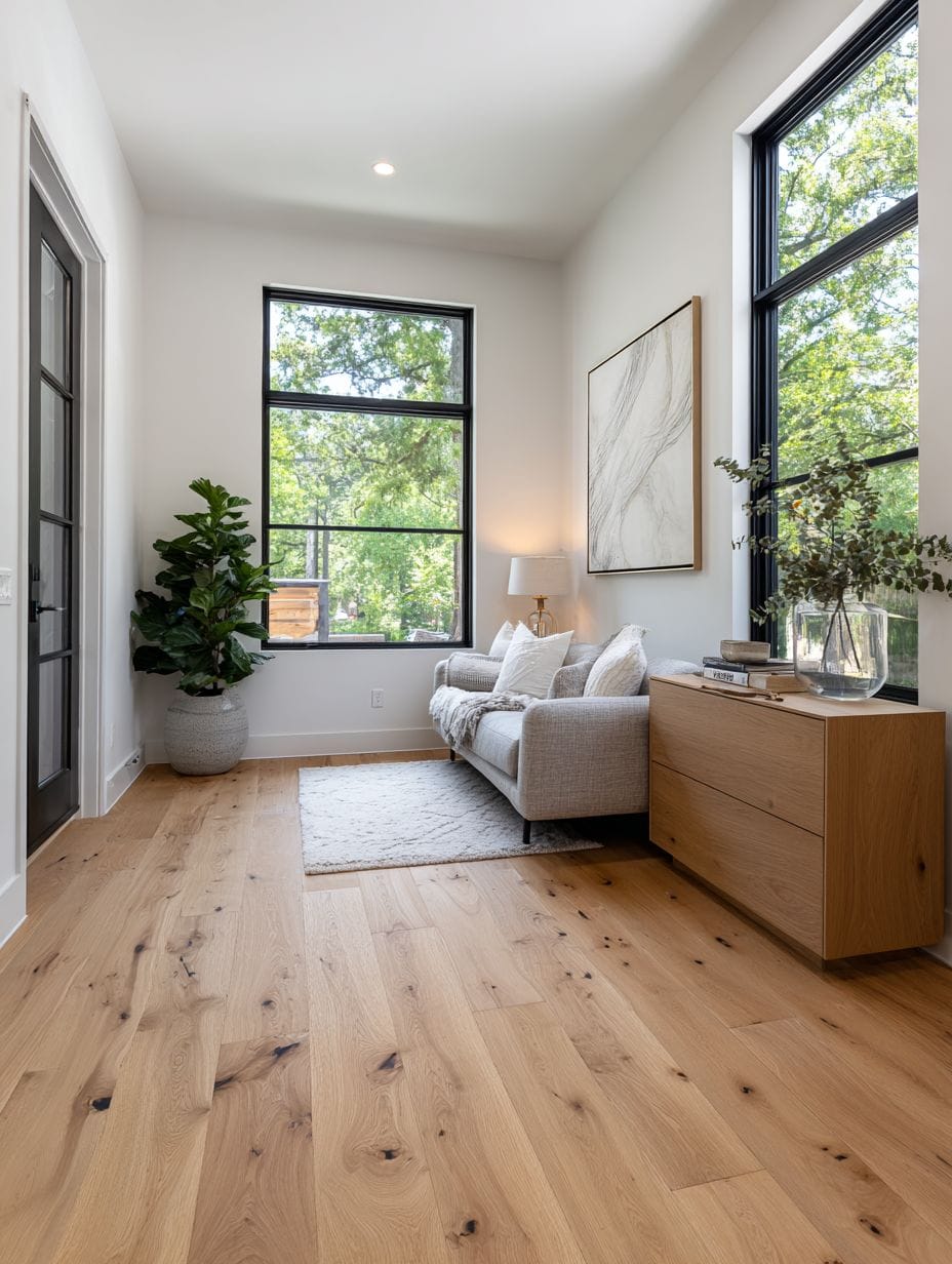 Light oak hardwood floors complement the neutral scheme while introducing natural warmth through their golden undertones and visible grain patterns. The wood flooring serves as a reminder that minimalism embraces natural materials and their inherent beauty rather than rejecting all ornamentation. The floors’ natural variations in tone and texture provide visual interest at the foundation level, allowing the walls and furniture to remain simple and unadorned. This strategic distribution of visual interest prevents the space from feeling bland while maintaining minimalist restraint.