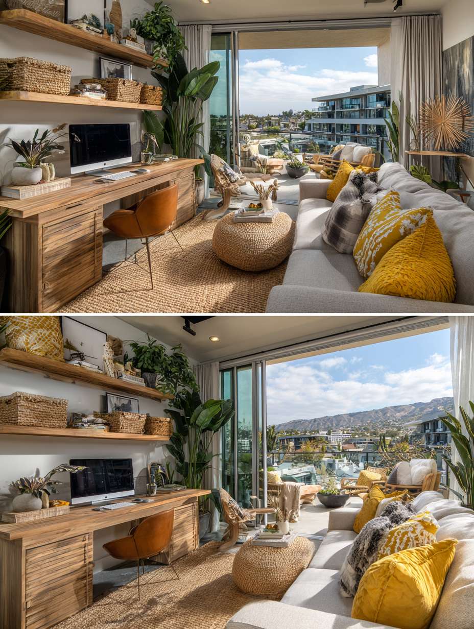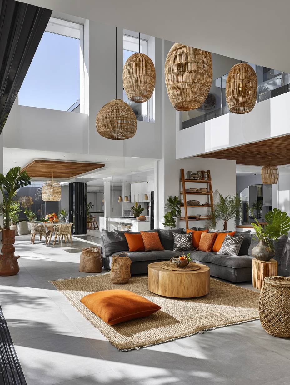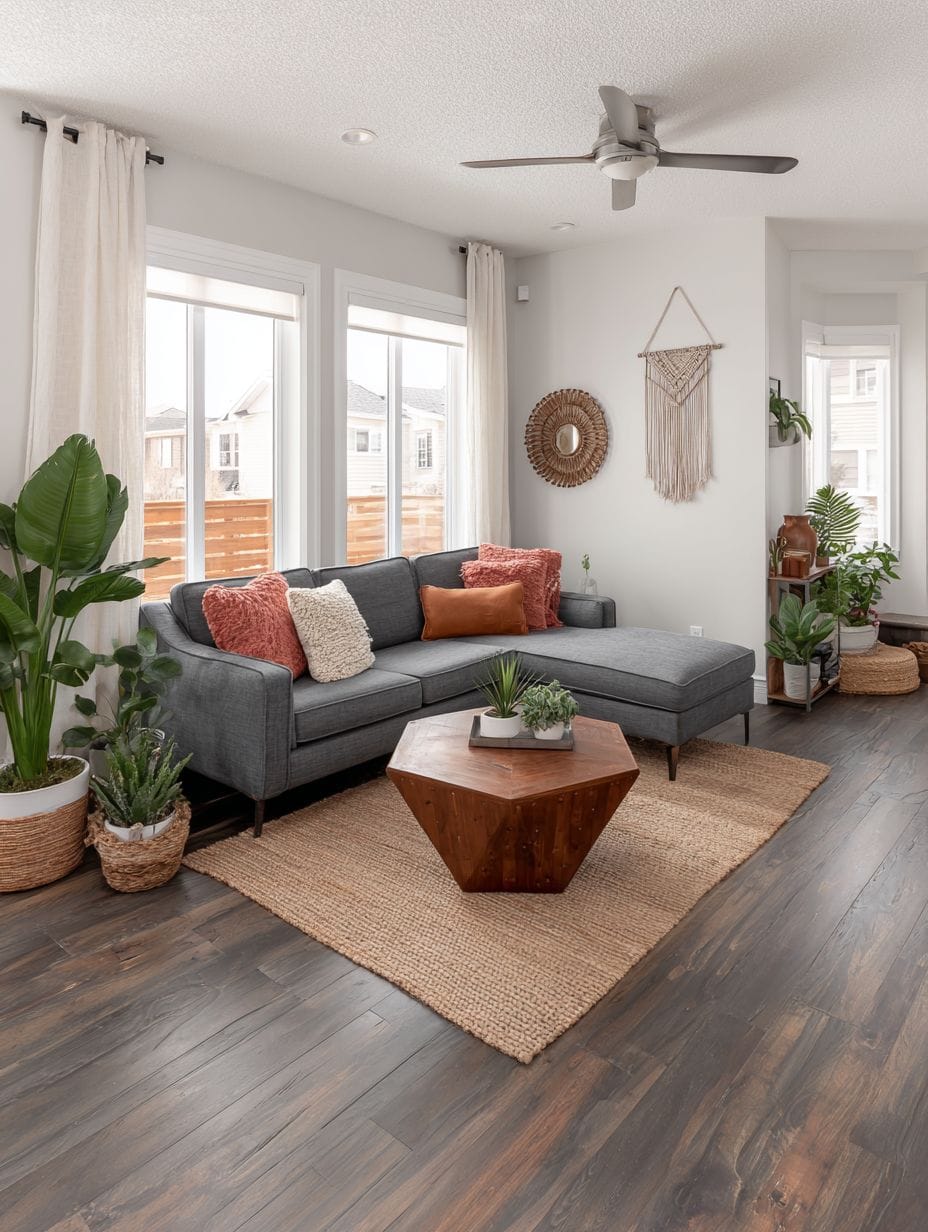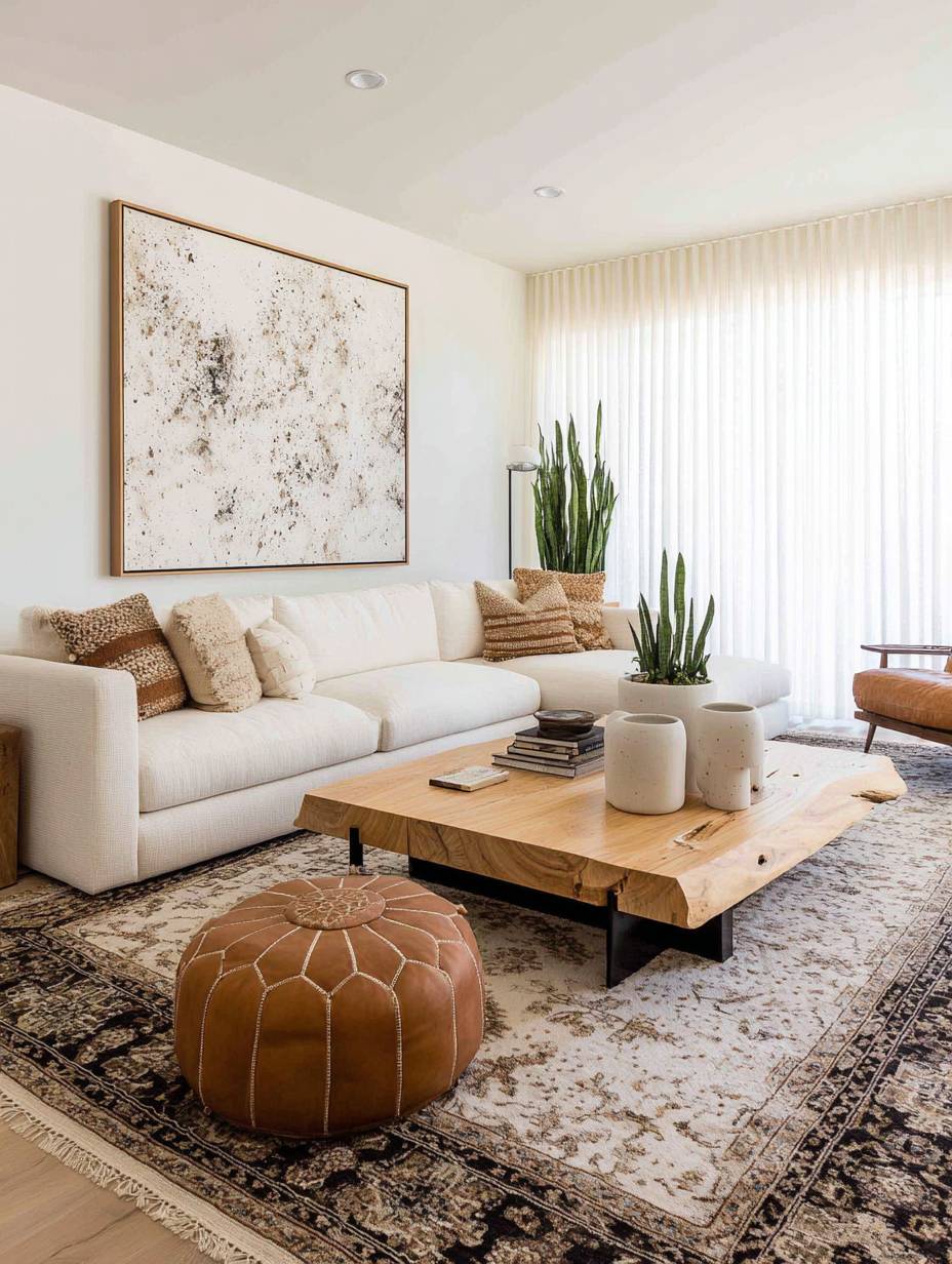 - Incorporate natural materials through rugs, coffee tables, and plant displays to bridge modern and bohemian aesthetics.