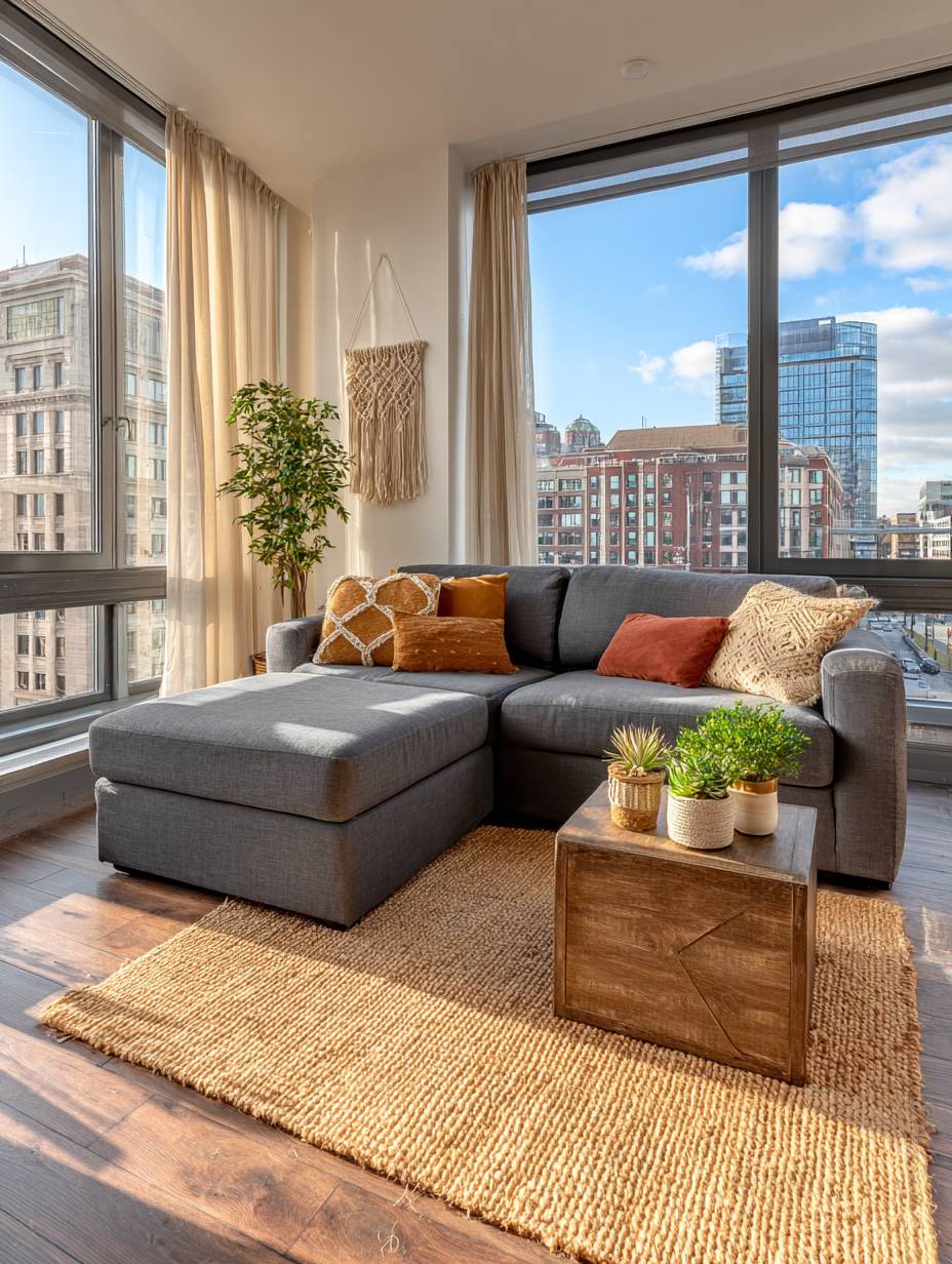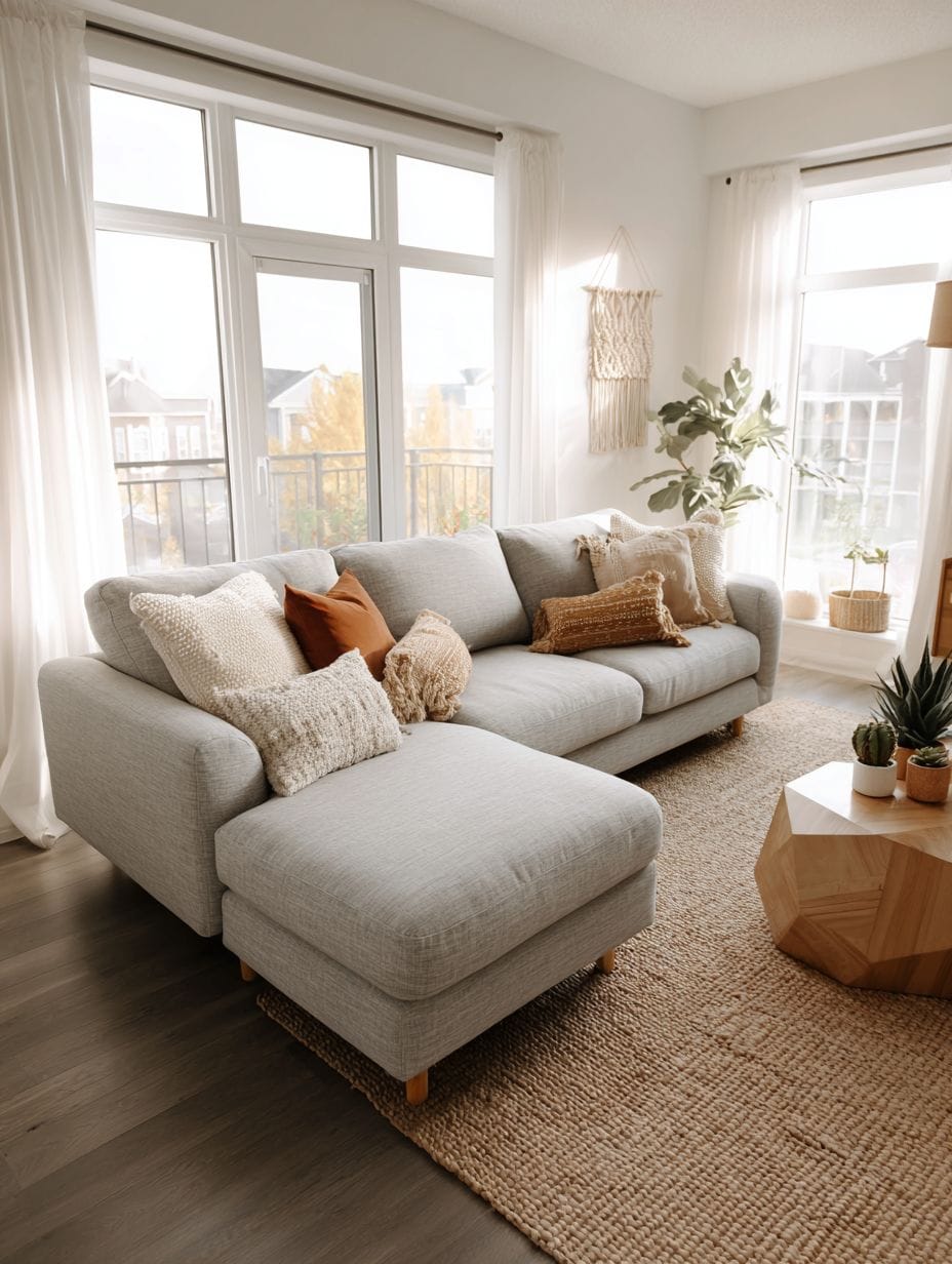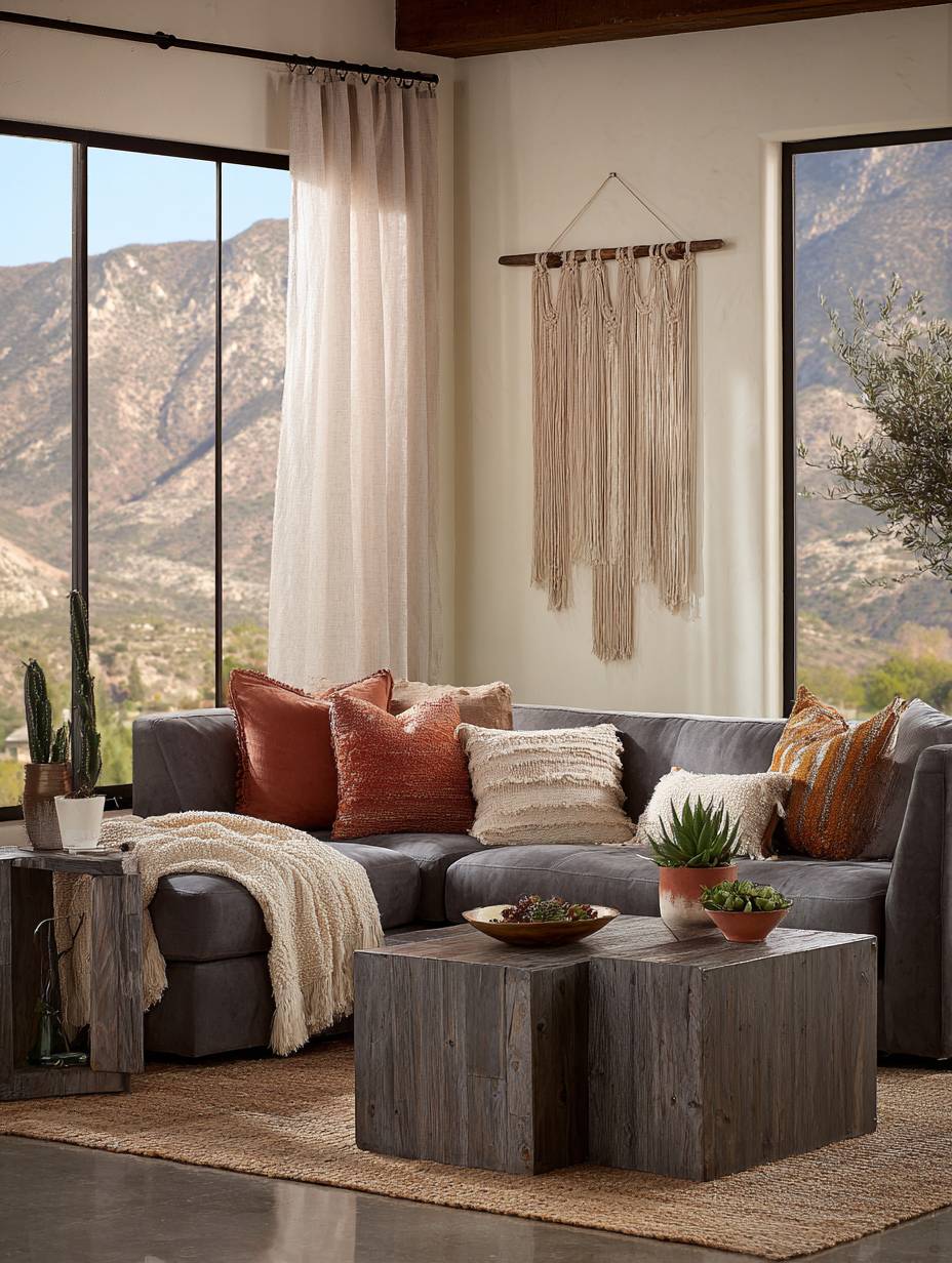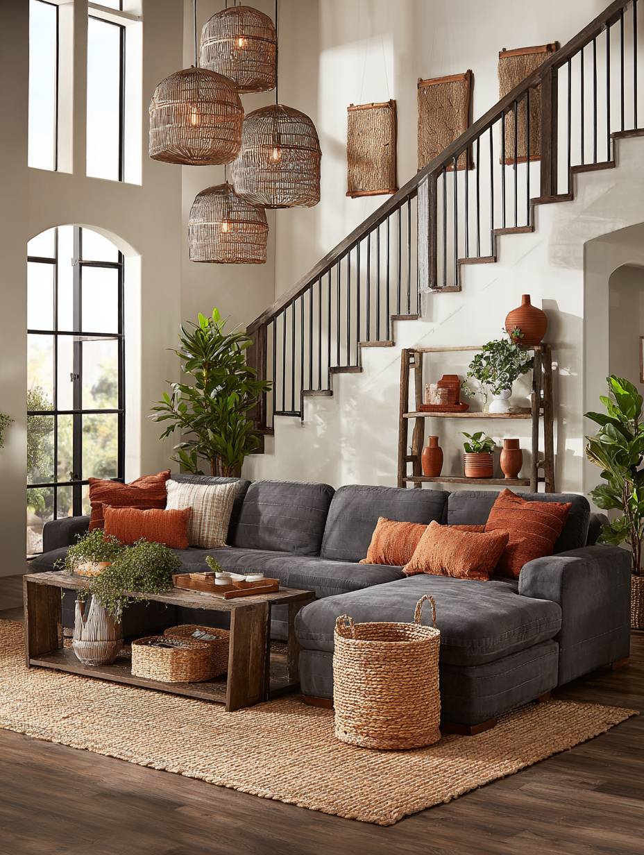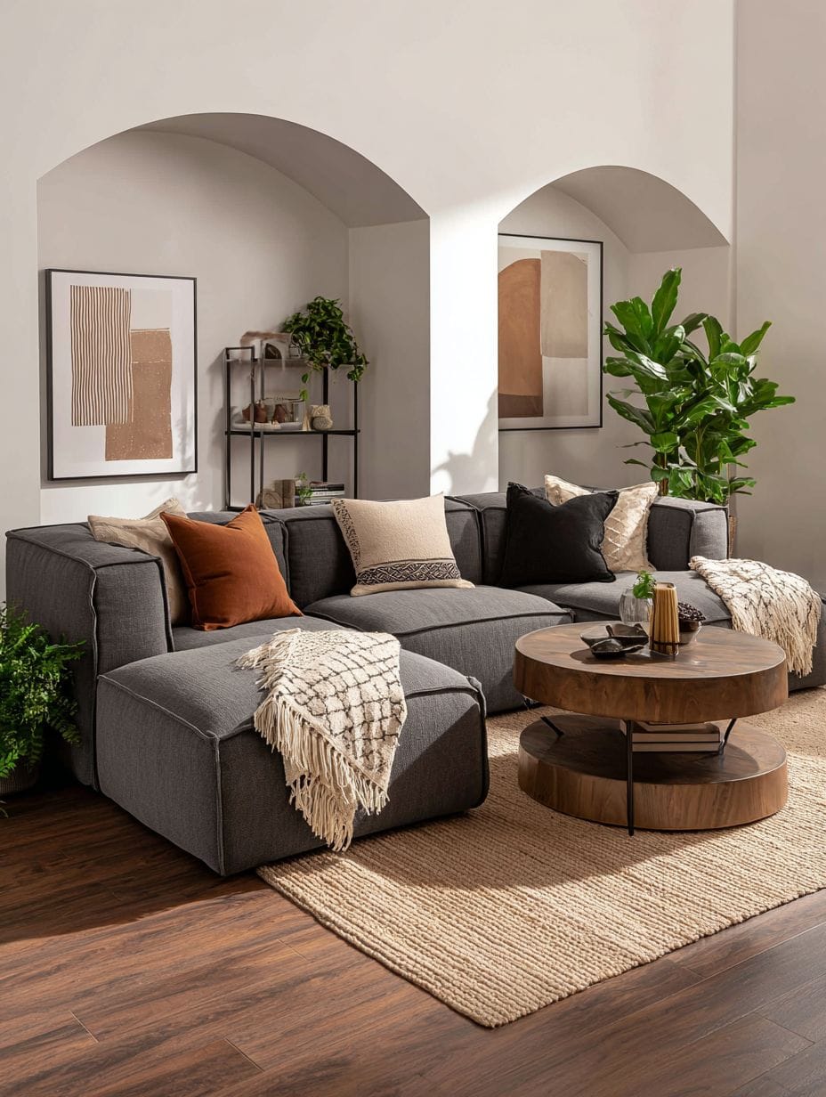 This design concept centers around a sleek grey sectional sofa that provides the perfect neutral foundation for an explosion of carefully curated textures and colors. The contemporary silhouette of the sofa keeps the space feeling current and uncluttered, while an eclectic mix of throw pillows in terracotta, mustard, and cream tones introduces the warmth and personality characteristic of bohemian style. Each pillow tells its own story through varied textures—chunky knits, smooth velvets, and handwoven fabrics with subtle imperfections that speak to their artisanal origins.