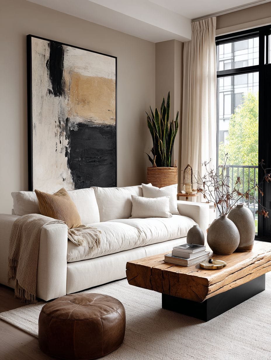 A large potted bird of paradise plant commands attention with its dramatic paddle-shaped leaves and substantial height, creating a living focal point that brings tropical drama and vertical interest to the space. Its placement near the seating area makes the living room feel like a lush retreat while its sculptural qualities mean it functions as both plant and art. On the wall hangs abstract art in earth tones—ochre, sienna, cream, and charcoal—that echoes the colors found in the textiles below, creating color cohesion throughout the vertical plane of the room. A natural fiber rug anchors the entire arrangement, its neutral tone and organic texture providing foundation without pattern overload. This design celebrates the modern boho principle of creating comfort through layers while maintaining enough restraint to keep the space feeling curated rather than cluttered.