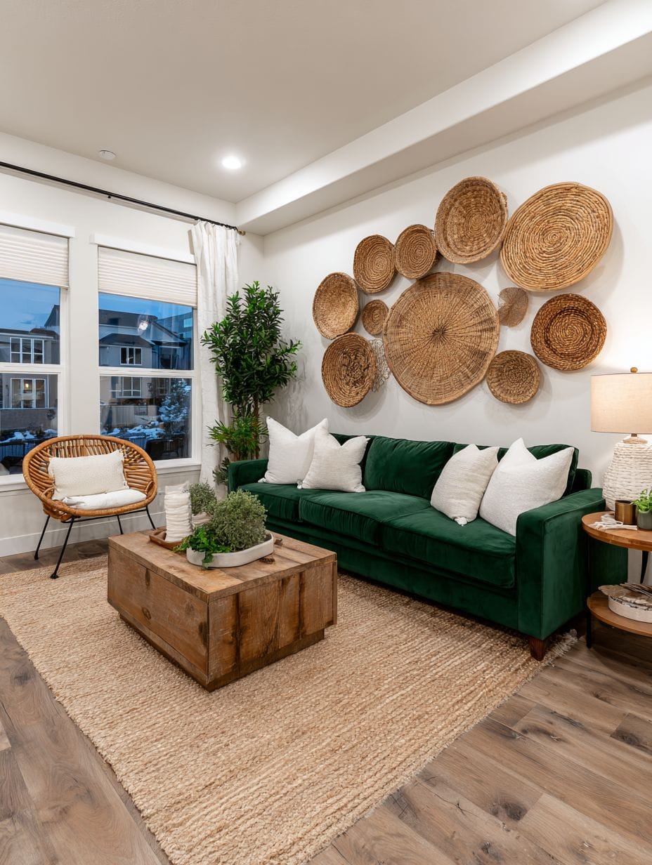 A woven wall basket collection creates a striking focal point on the adjacent wall, these functional African or Indonesian baskets displayed as art. Their varying sizes, patterns, and weaving techniques create visual rhythm and textural interest while celebrating traditional craftsmanship from specific cultural traditions. This display transforms everyday objects into artistic statements, a very bohemian approach to decoration. A natural fiber rug grounds this intimate corner arrangement, its neutral tone allowing the furniture and wall display to take center stage. A large window with simple white curtain provides natural light that illuminates the textures present throughout—the velvet pile, woven rattan, and basket weaving all revealed in their beautiful detail. This design proves that modern boho thrives on thoughtful eclecticism, mixing pieces from different eras and traditions in ways that feel intentional and harmonious rather than random or chaotic.