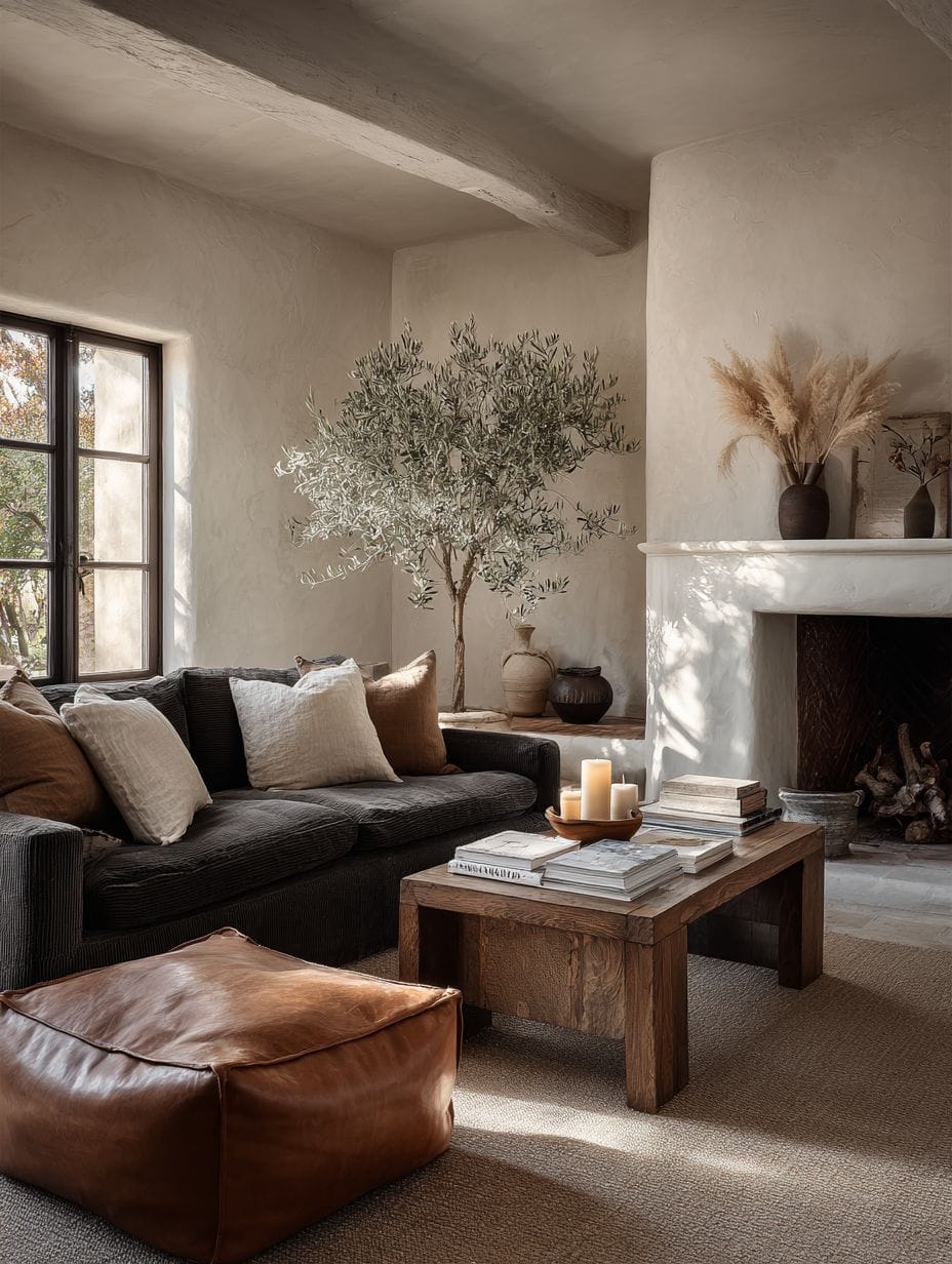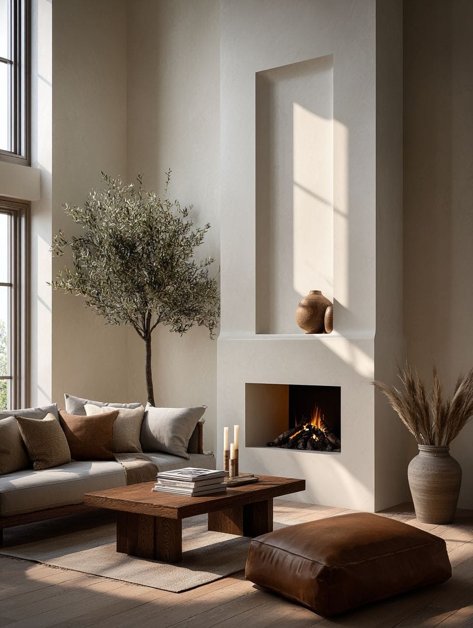 The coffee table is deliberately simple—clean-lined wood in natural finish—displaying only books and candles, accessories chosen for their ability to create ambiance and spark conversation without cluttering the surface. A potted olive tree positioned nearby adds organic verticality and living greenery, its silvery foliage and sculptural branching structure making it both plant and art piece. Natural light from a side window creates gentle shadows that emphasize the clean lines of the fireplace while adding dimension to the layered textiles on the sofa. This design illustrates how modern boho can be achieved through careful curation and restraint, proving that fewer carefully chosen elements often create more impact than abundant decoration.