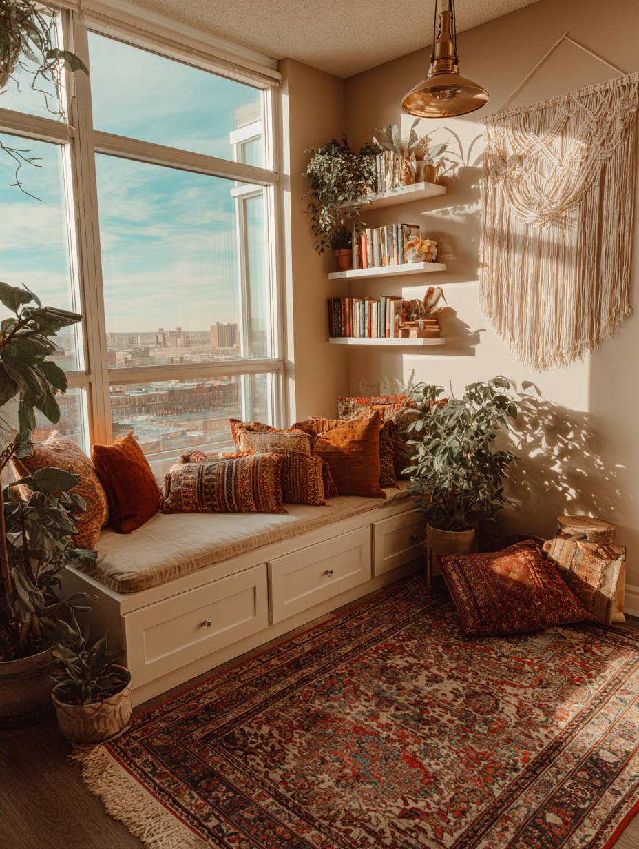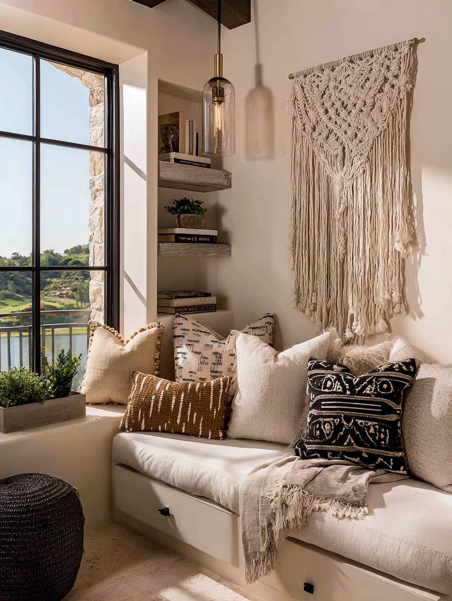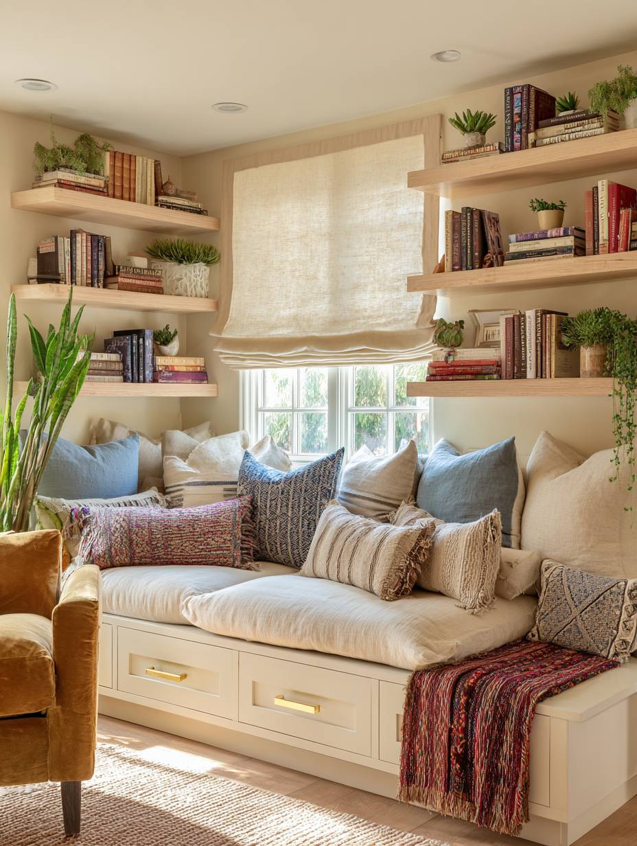 The collection of throw pillows adorning this window seat is where bohemian personality truly shines. Colorful pillows in global patterns—ikat, mudcloth, suzani—introduce cultural richness and visual energy to the neutral cushion base. These patterns tell stories of different textile traditions from around the world, celebrating the global influences that define bohemian style. The varied sizes and shapes of pillows create a composed casualness—they look arranged but not rigid, inviting rather than pristine. Above the bench, floating shelves hold a carefully edited selection of books and small potted plants, keeping favorite reads and living greenery within easy reach while maintaining the uncluttered aesthetic that prevents the nook from feeling cramped.