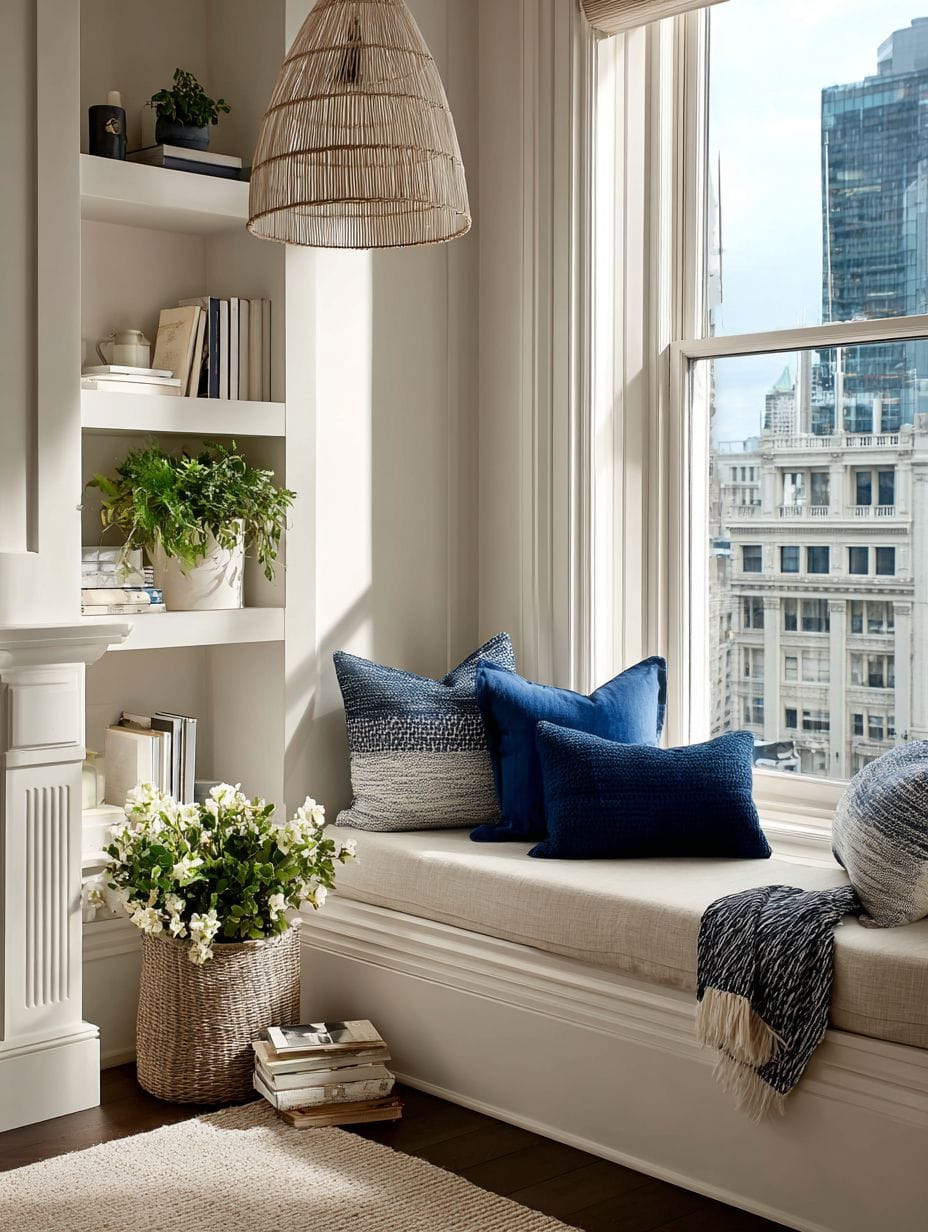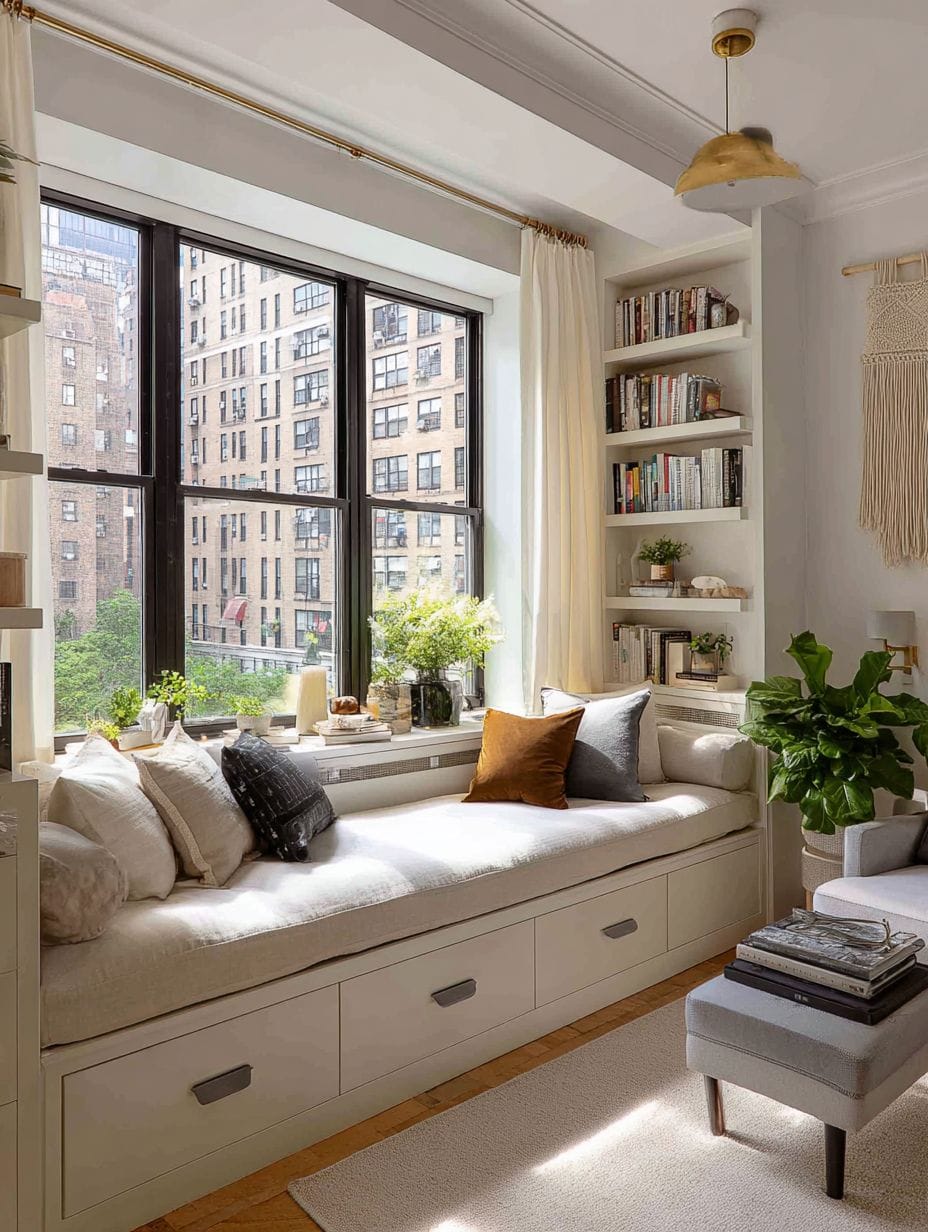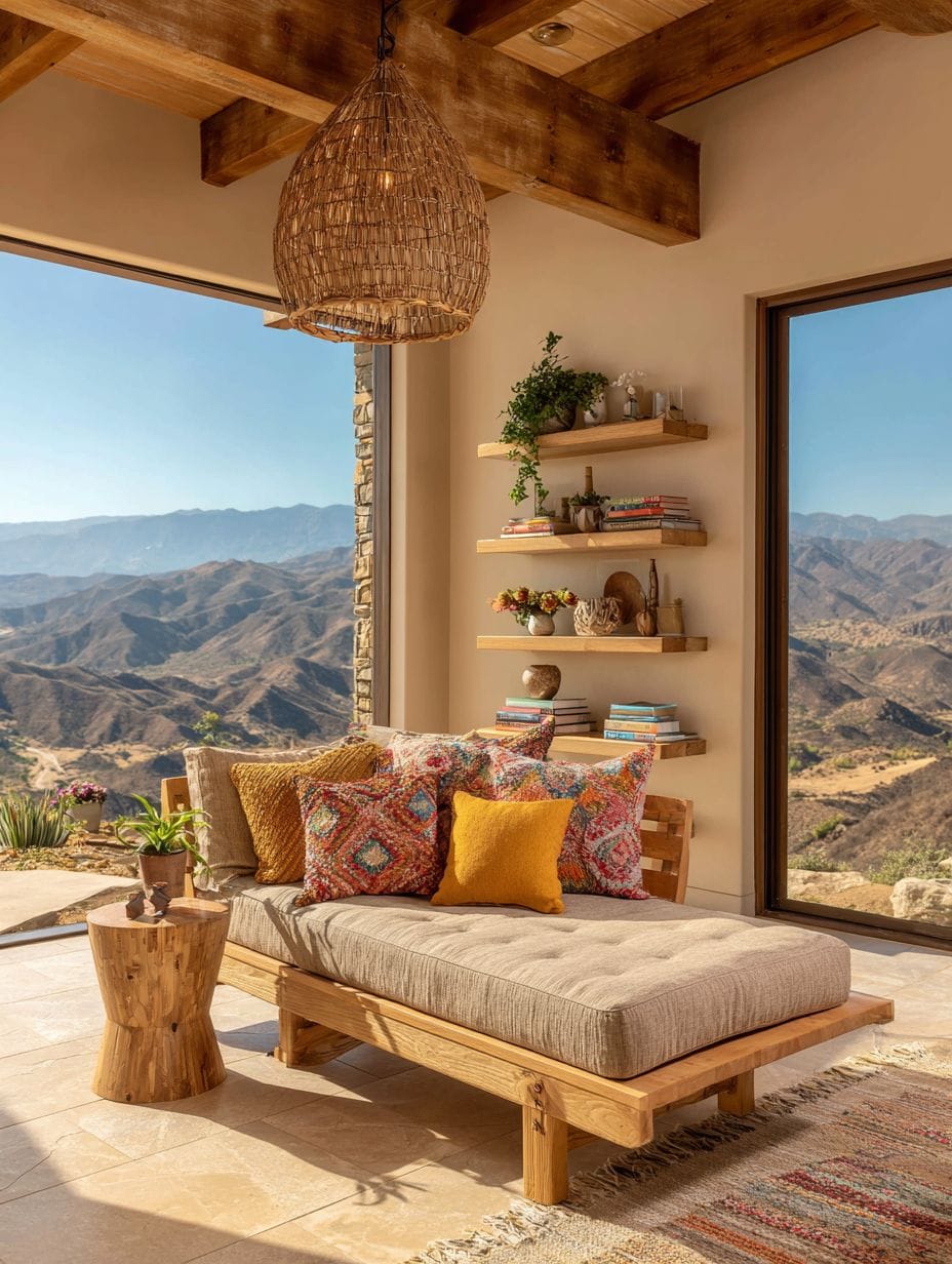 The collection of throw pillows adorning this window seat is where bohemian personality truly shines. Colorful pillows in global patterns—ikat, mudcloth, suzani—introduce cultural richness and visual energy to the neutral cushion base. These patterns tell stories of different textile traditions from around the world, celebrating the global influences that define bohemian style. The varied sizes and shapes of pillows create a composed casualness—they look arranged but not rigid, inviting rather than pristine. Above the bench, floating shelves hold a carefully edited selection of books and small potted plants, keeping favorite reads and living greenery within easy reach while maintaining the uncluttered aesthetic that prevents the nook from feeling cramped.