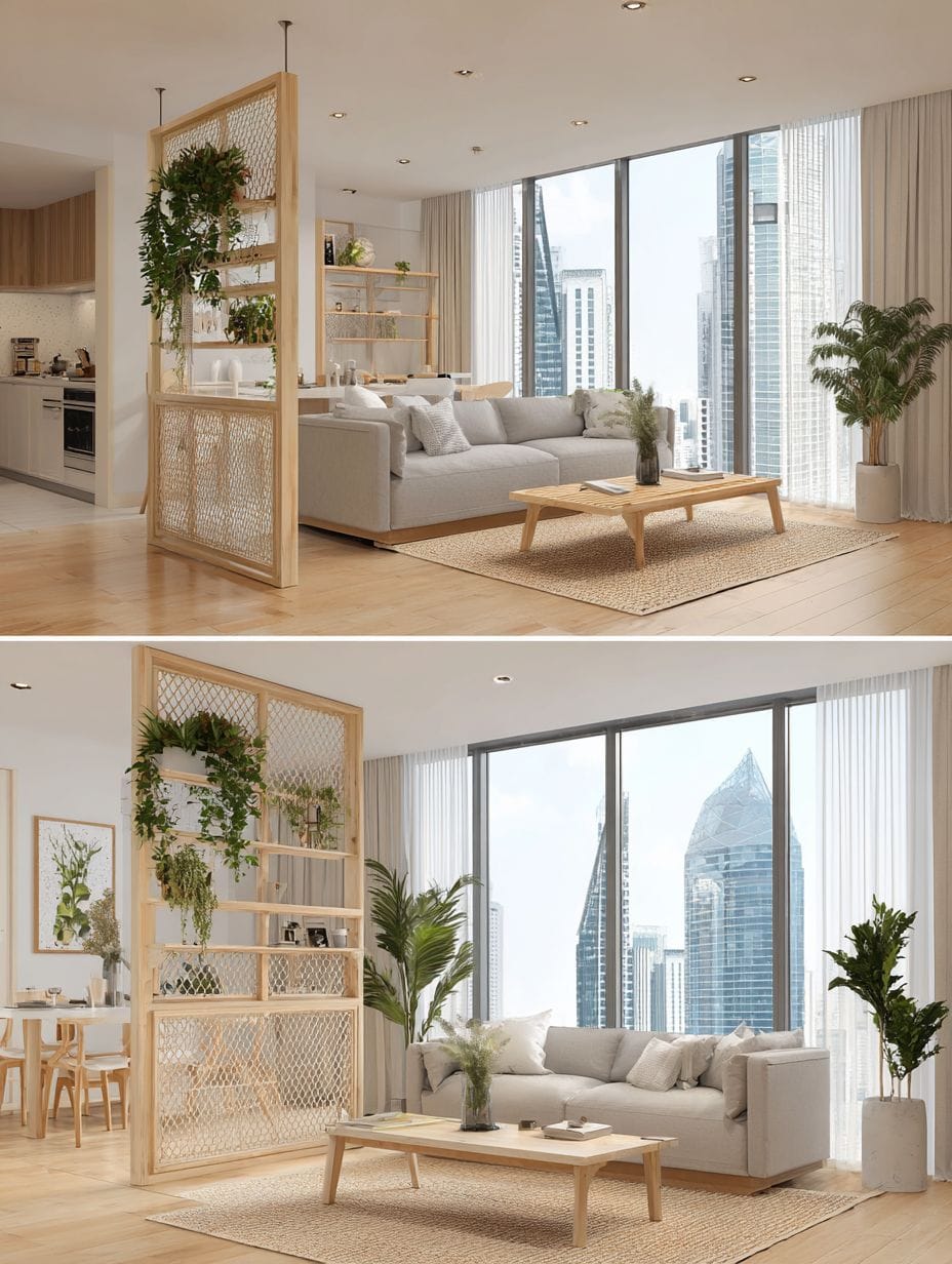 - Choose natural materials for dividers like wood and rope that add texture rather than visual weight.
