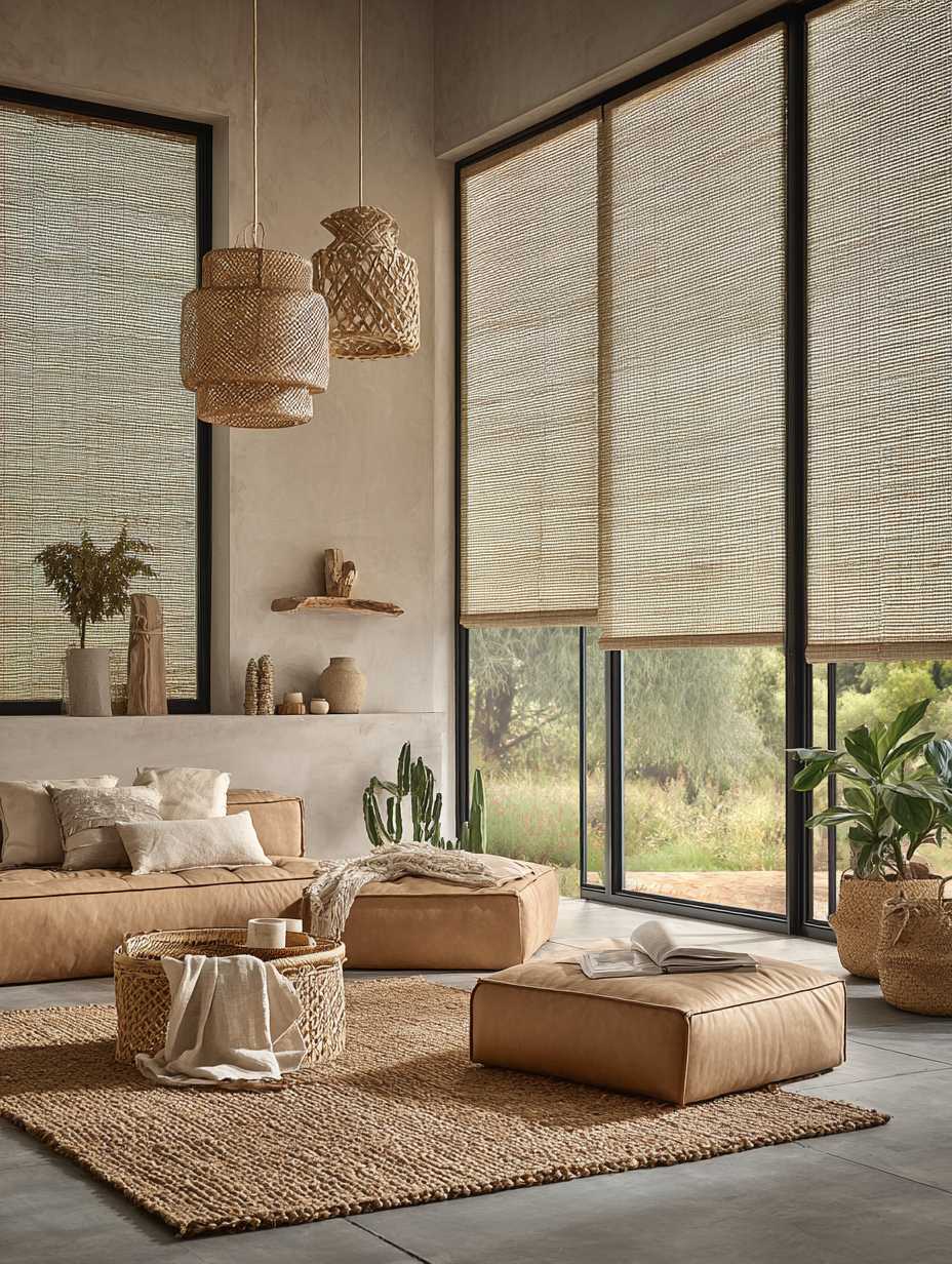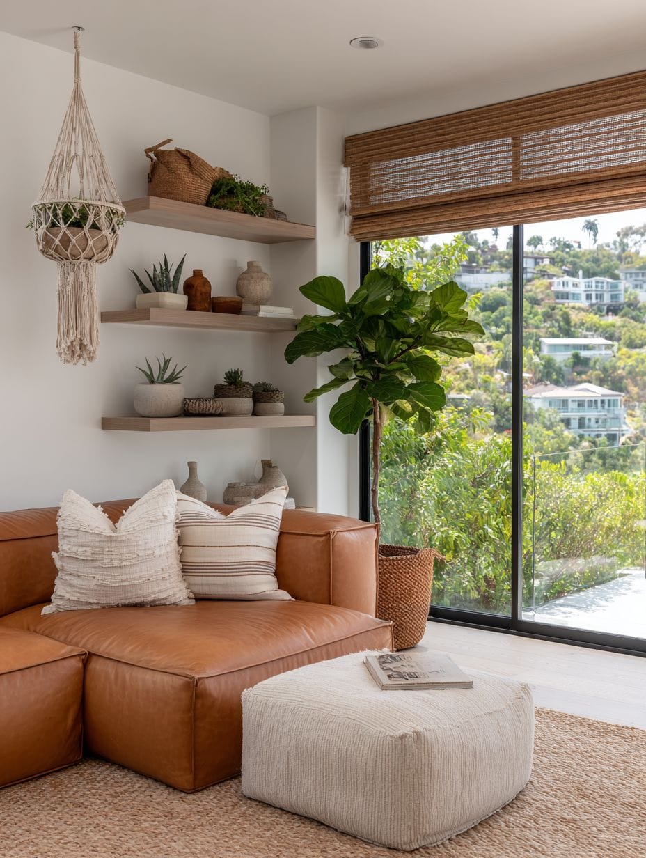 This modern boho living room takes a distinctly minimalist approach, proving that bohemian style doesn’t require abundant pattern or decoration to create warmth and character. Floor-to-ceiling windows become the defining architectural feature, dressed simply with wooden blinds that allow for light control without adding visual weight through heavy drapes or elaborate window treatments. The filtered natural light creates ever-changing patterns throughout the day, adding visual interest without requiring additional decoration. This abundance of natural light also allows the natural materials in the space to truly shine, highlighting wood grain, leather texture, and plant foliage.