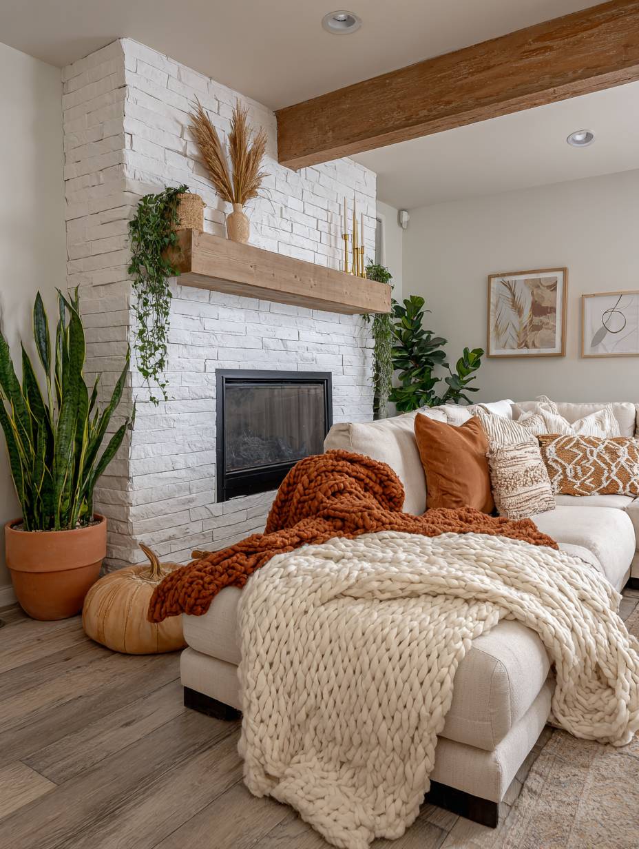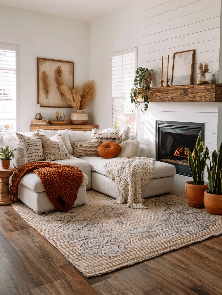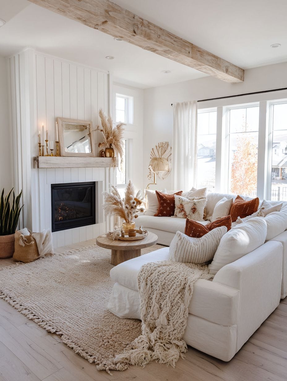 The natural wood beam mantel creates a beautiful material contrast against the white shiplap, introducing warmth and texture while providing the perfect display surface for brass candlesticks and dried pampas grass. These decorative elements are chosen not just for their aesthetic appeal but for their textural variety—the cool metal of brass, the feathery softness of pampas, and the organic grain of wood create a sensory-rich composition. Below, a neutral sectional with distinctly contemporary clean lines is styled with chunky knit throws and patterned pillows in rust and sage tones, colors that echo the natural elements displayed on the mantel and create visual cohesion throughout the space.