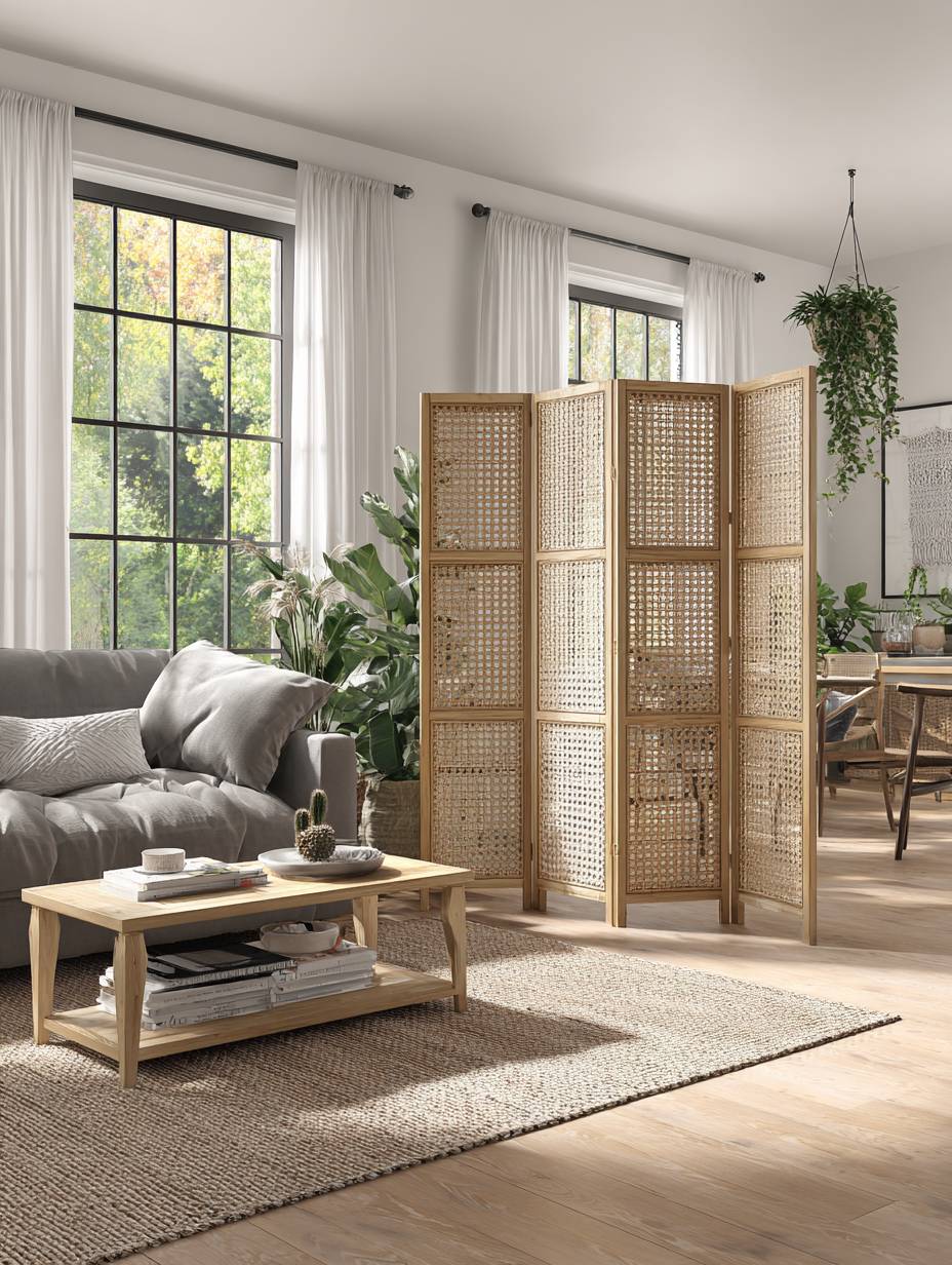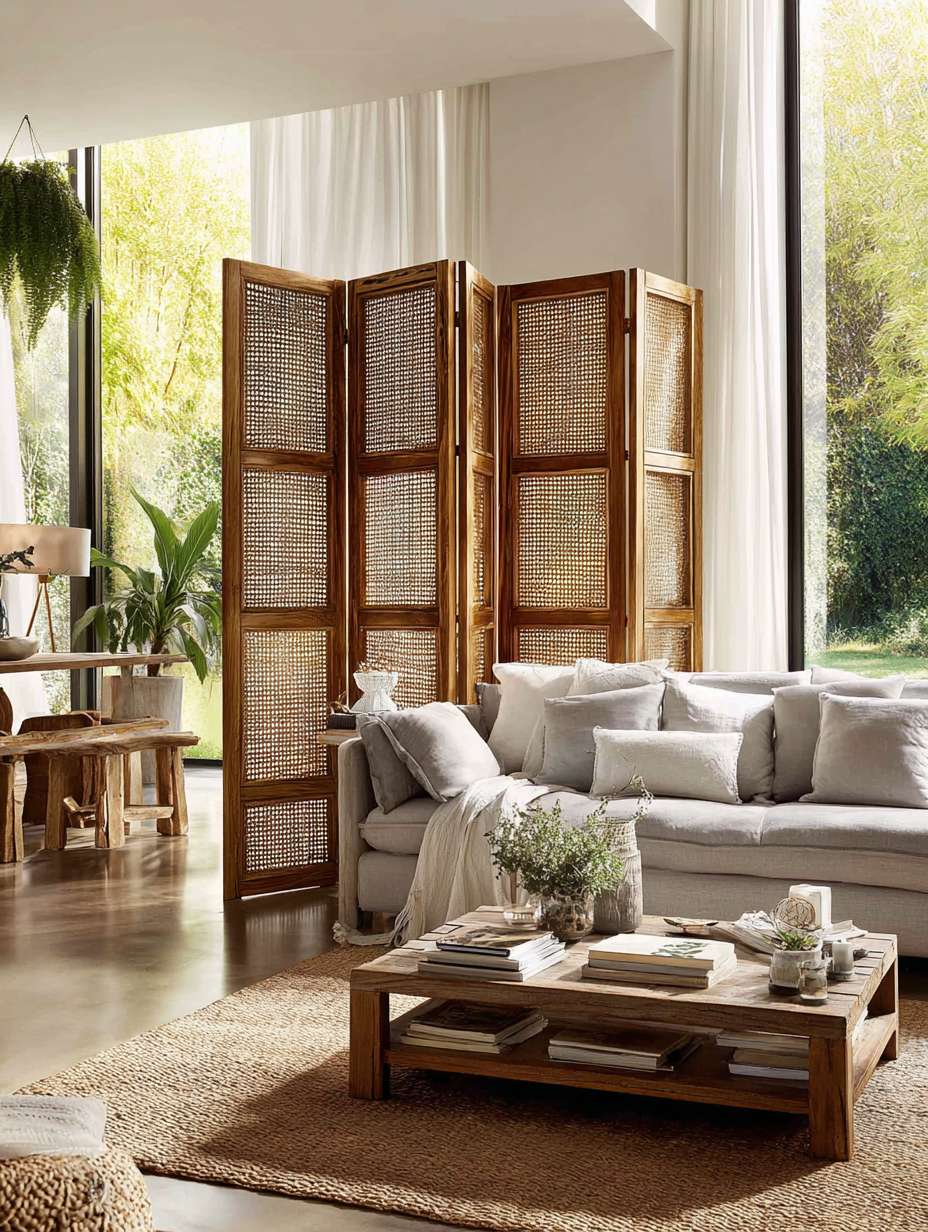 On the living room side of this divider sits a sofa in grey facing a coffee table displaying books and plants—the essential elements of relaxed modern boho living. The grey upholstery maintains neutral sophistication that works in multipurpose spaces visible from multiple angles, while the coffee table styling introduces personality without permanent commitment. On the other side, glimpses of a dining area can be seen, the room divider successfully creating functional separation without the visual weight and spatial commitment of a solid wall. This solution is particularly valuable in smaller homes or apartments where every square foot matters.