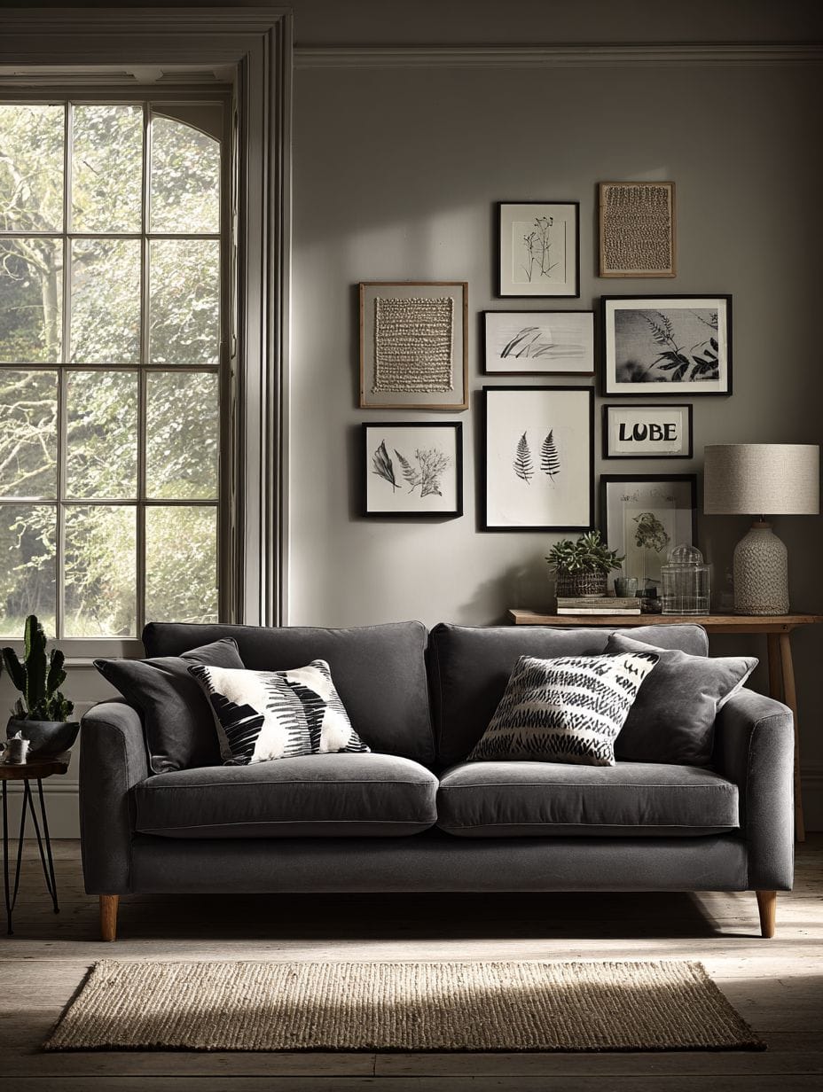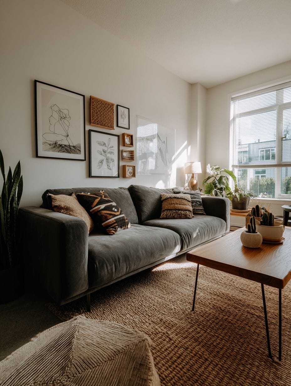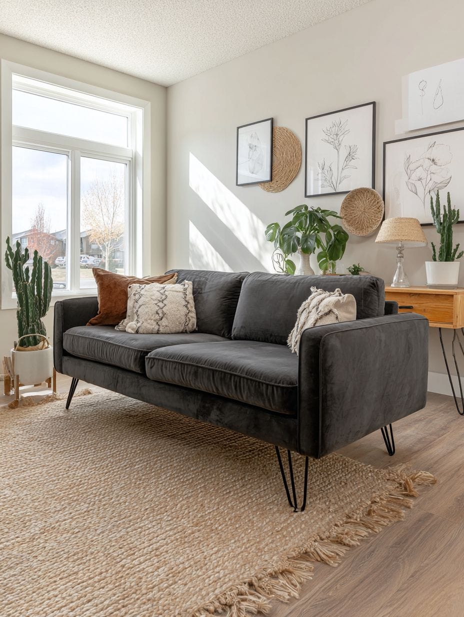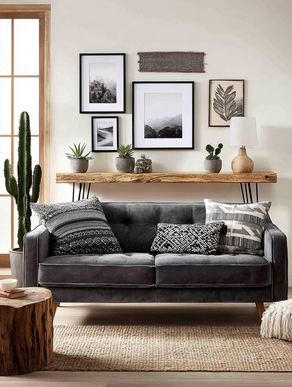 Below this artistic focal wall sits a streamlined sofa in charcoal grey with luxurious velvet texture, demonstrating how modern boho design isn’t afraid of sophisticated materials and rich colors. The velvet’s subtle sheen catches light beautifully, creating visual interest through material rather than pattern. This piece is styled with handwoven cushions featuring geometric patterns—designs that feel both contemporary in their clean lines and bohemian in their handcrafted origins. The cushions’ patterns introduce controlled visual complexity without overwhelming the space, their geometric nature feeling at home with both the modern sofa and the eclectic gallery wall above.