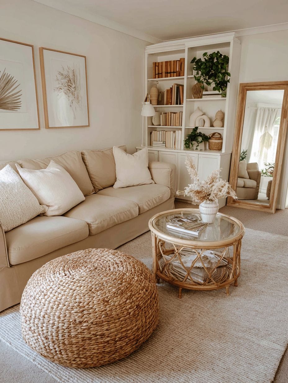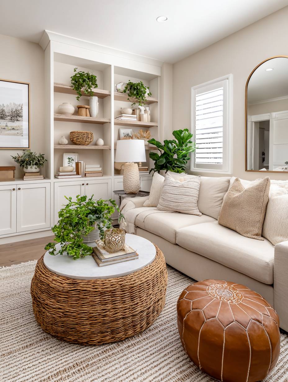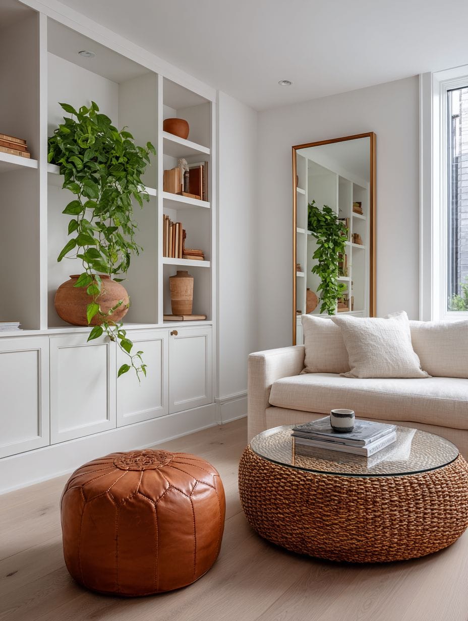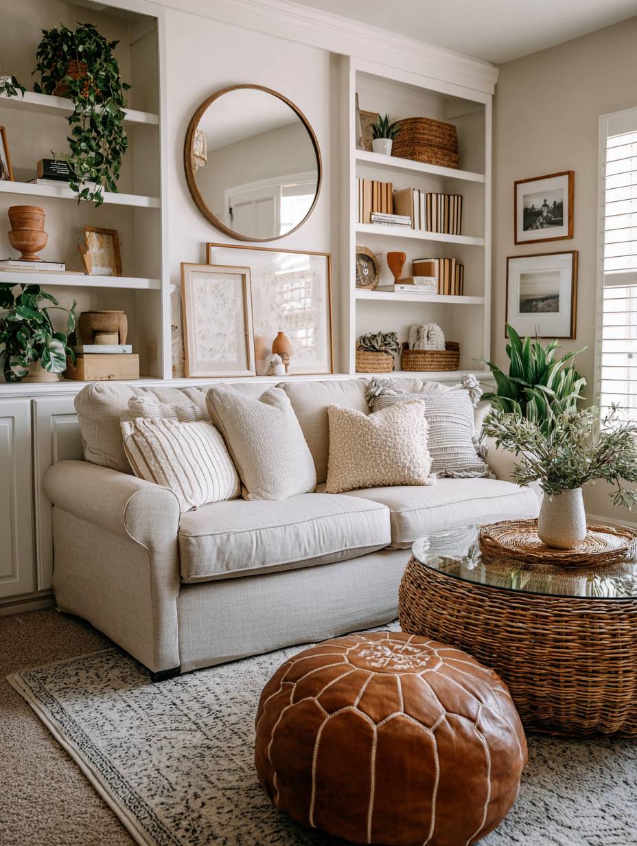 The seating area features a clean-lined sofa in natural beige that doesn’t compete with the shelving for attention, instead providing a comfortable viewing point for appreciating the curated display. A round rattan coffee table with a glass top introduces bohemian texture while the glass ensures it doesn’t visually block the impressive shelving beyond. A Moroccan pouf in hand-tooled leather provides flexible additional seating, its portability and casual elegance embodying the relaxed sophistication of modern boho style. An oversized mirror with a simple frame leans casually against the wall, its reflective surface bouncing natural window light around the room and making the space feel larger and brighter. This design proves that open shelving can be both beautiful and functional when styled with intention and restraint.