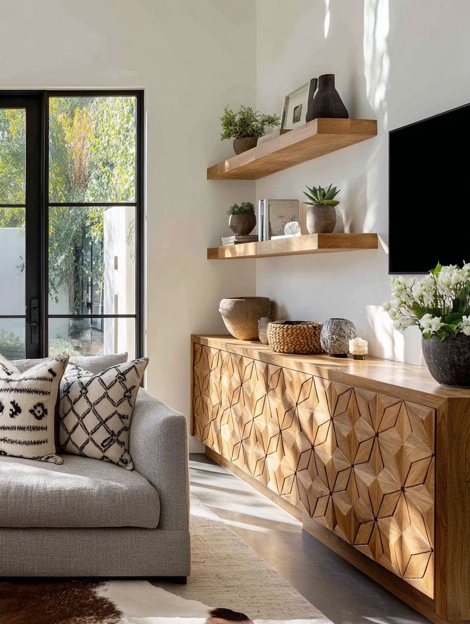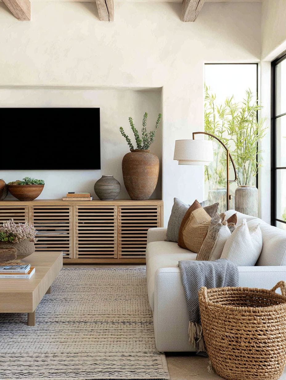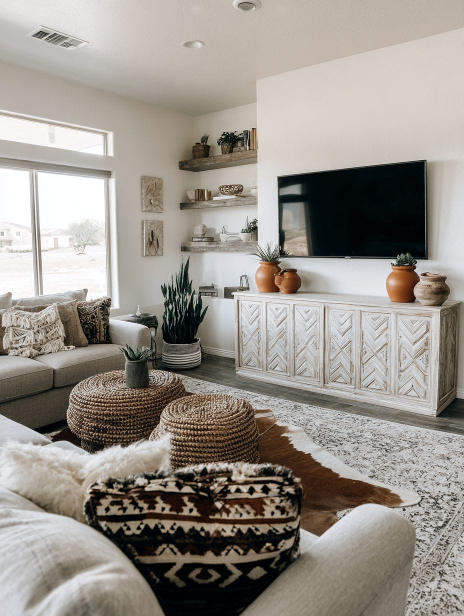 The contemporary sofa in grey linen faces this media wall, styled with layered cushions in muted southwestern patterns—geometric designs in rust, cream, and black that introduce cultural influence and visual interest without competing with the television when it’s in use. A cowhide rug adds organic texture and neutral pattern beneath the seating area, its natural variations and irregular shape bringing an earthy, collected quality that manufactured rugs cannot replicate. Natural light from an adjacent window creates gentle shadows that emphasize the wood grain in the console and add dimension to the thoughtfully composed space. This design successfully integrates modern media needs with bohemian aesthetic values, creating a living room that’s both highly functional and warmly inviting.