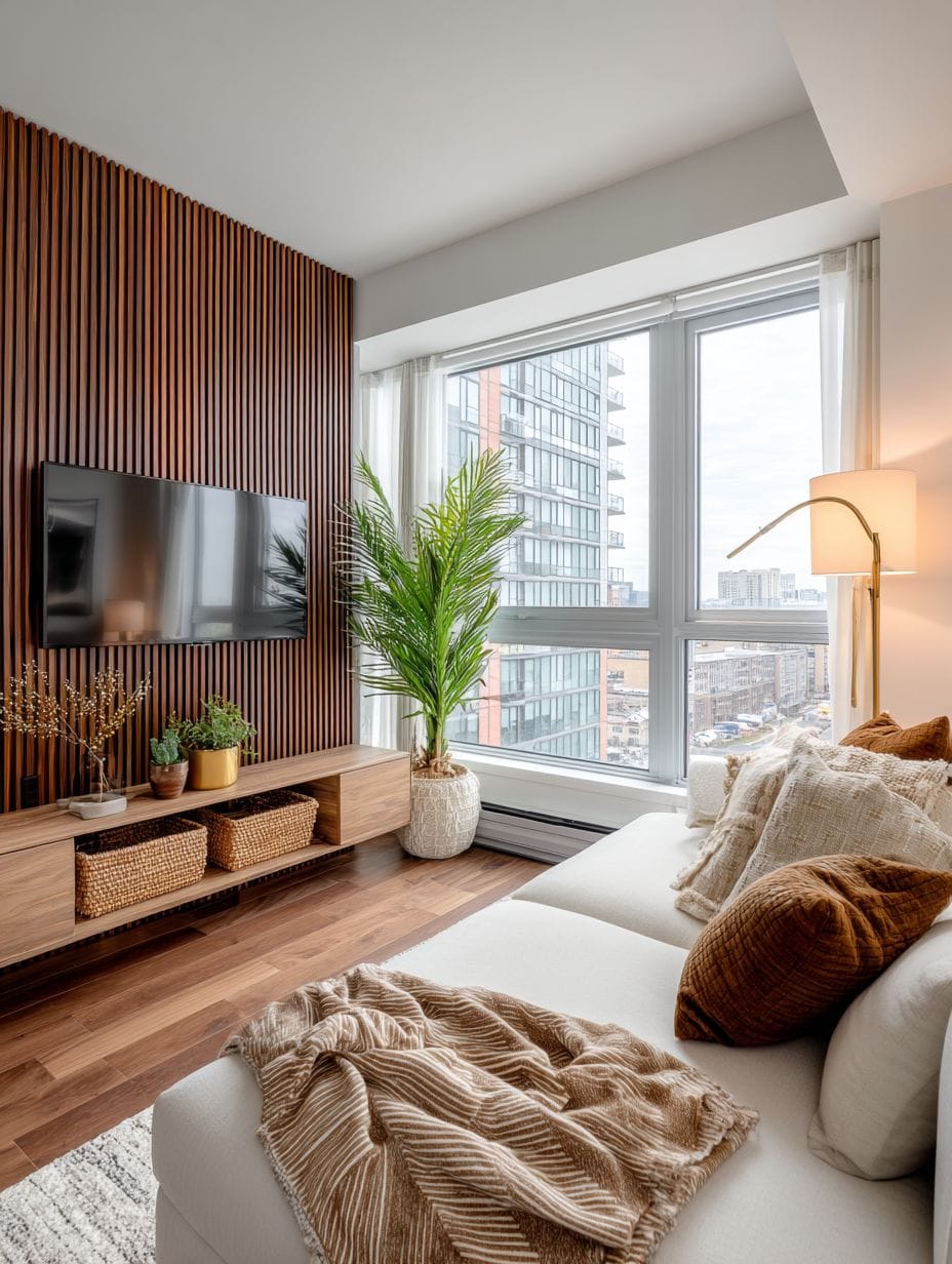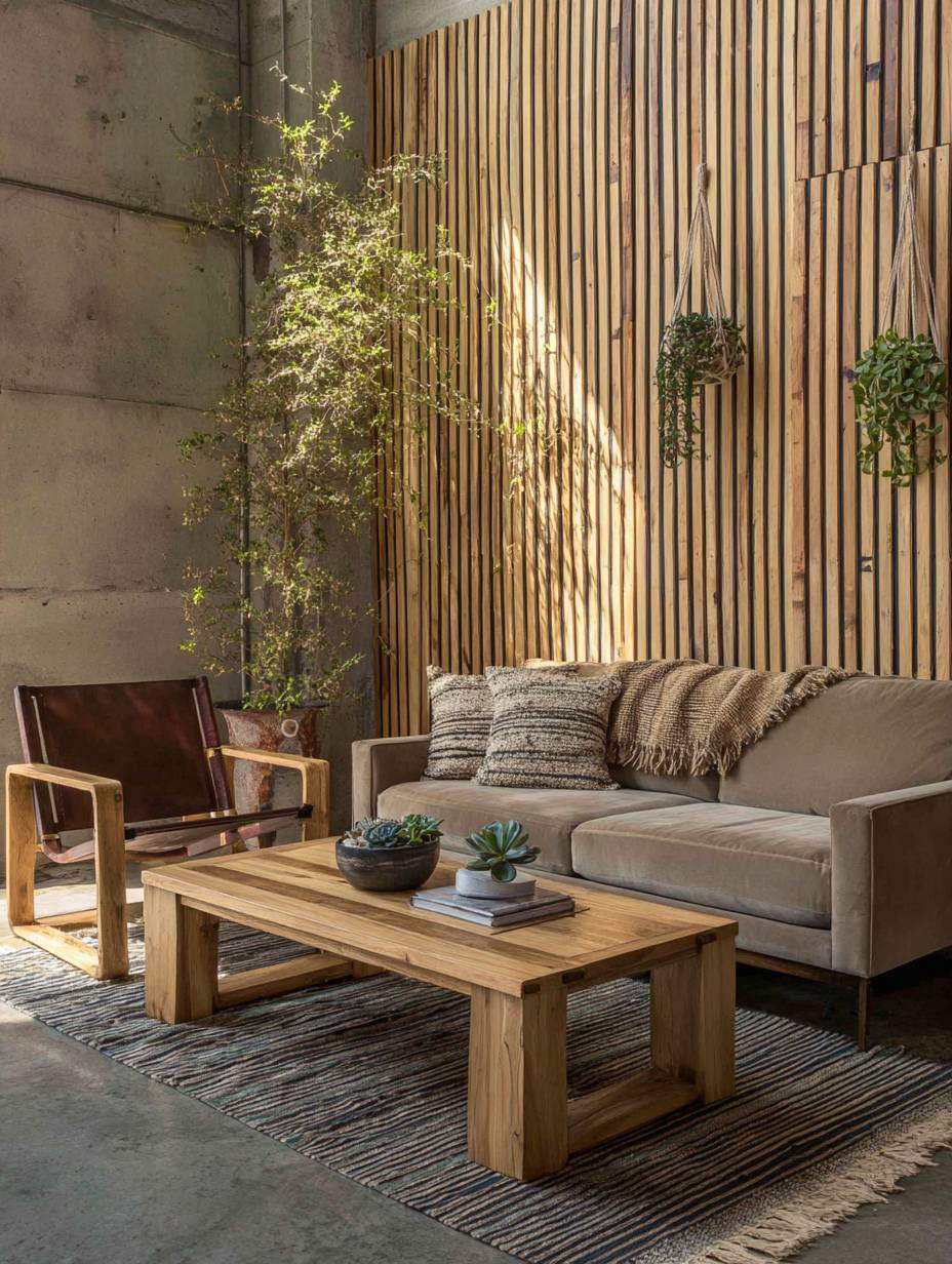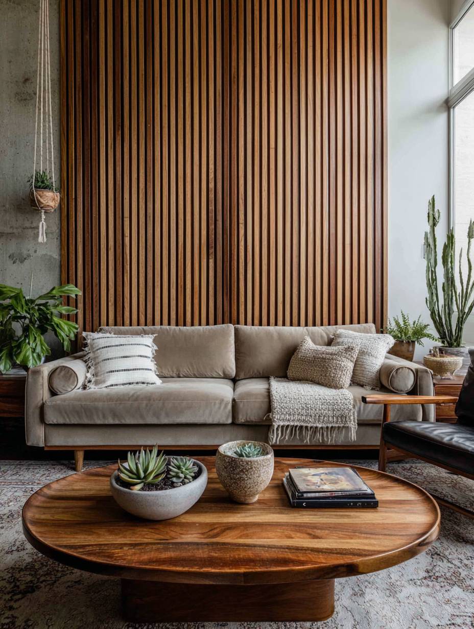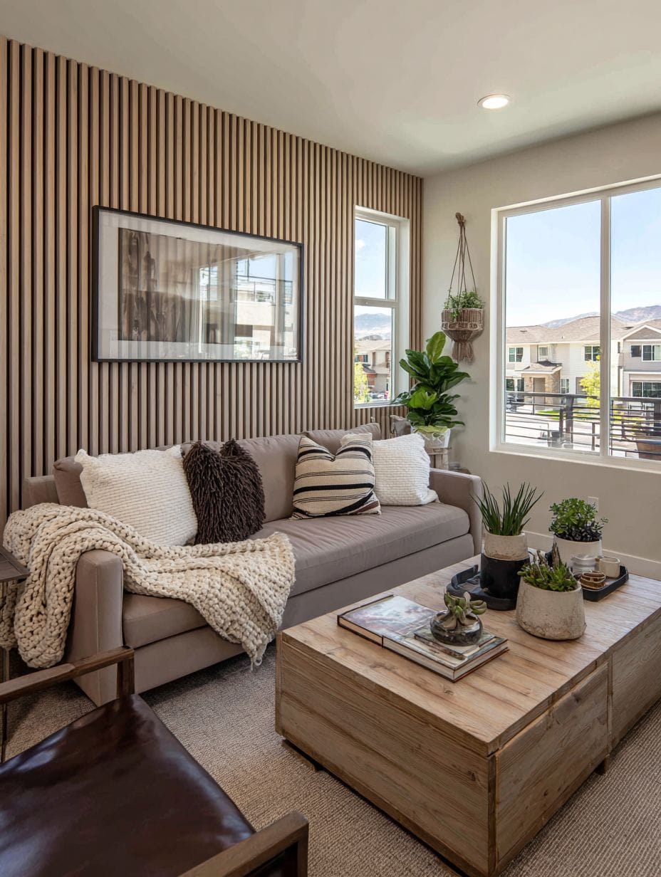 This modern boho living room features an accent wall with vertical wooden slats in natural finish, creating architectural texture and visual interest that serves as a stunning backdrop for the seating area. These slats represent a distinctly modern architectural detail—clean, geometric, and structural—yet their natural wood material and visible grain bring warmth and organic quality that aligns with bohemian values. The slats create subtle shadows that shift throughout the day as sunlight moves, providing constantly changing visual interest without requiring any additional decoration. This architectural feature demonstrates how modern construction can incorporate natural materials to create spaces that feel both contemporary and warmly inviting.