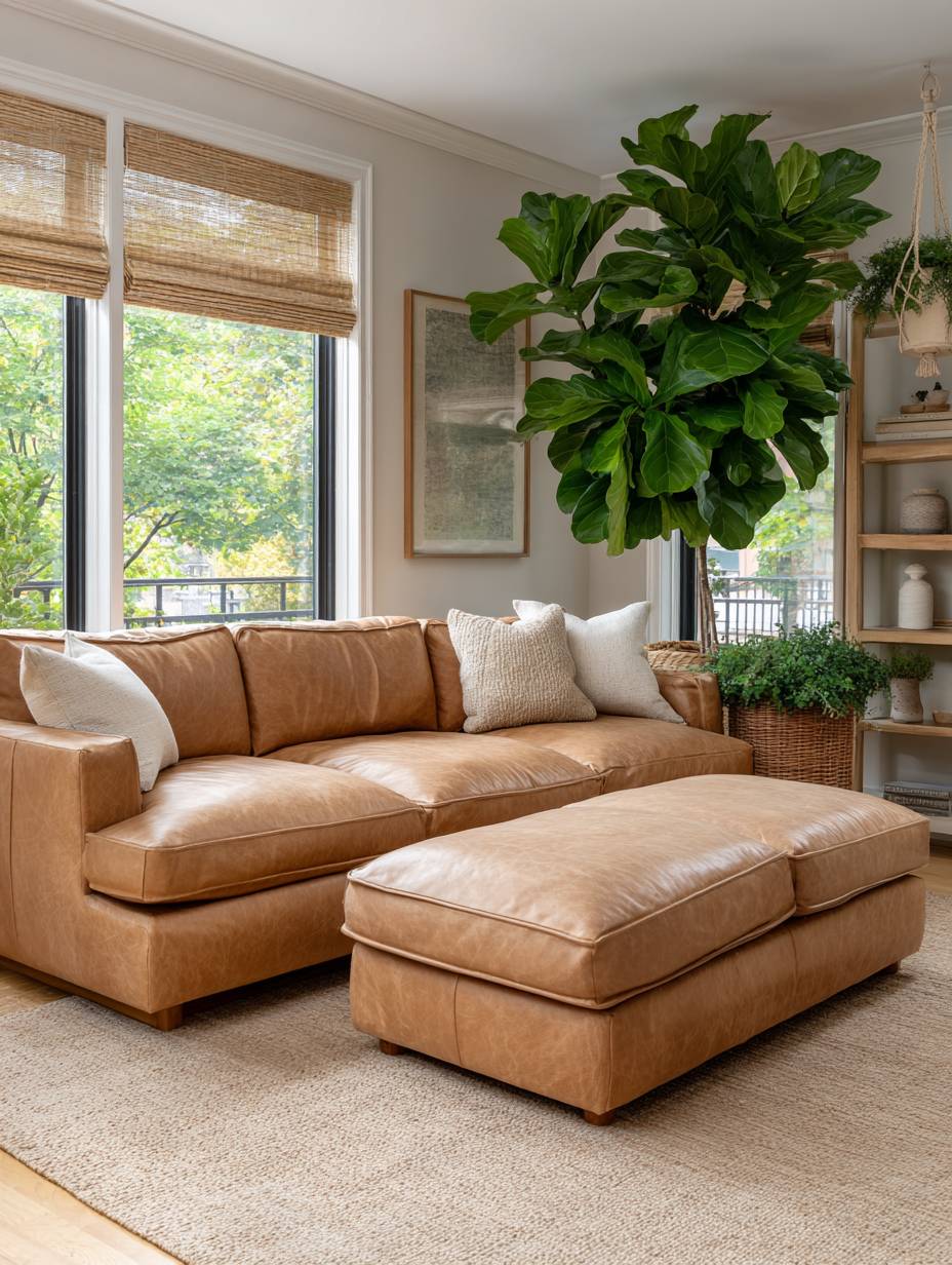 A low modular sofa in camel leather anchors the seating area, its contemporary form paired with a material choice that ages beautifully and becomes more characterful over time—a very bohemian quality. The leather’s warm tone prevents the minimalist space from feeling cold or sterile, while its durability makes it practical for real living. Paired with this is a textured linen ottoman that provides both additional seating and a soft surface for resting feet, its natural fiber and neutral tone complementing the leather sofa while introducing textural variety.