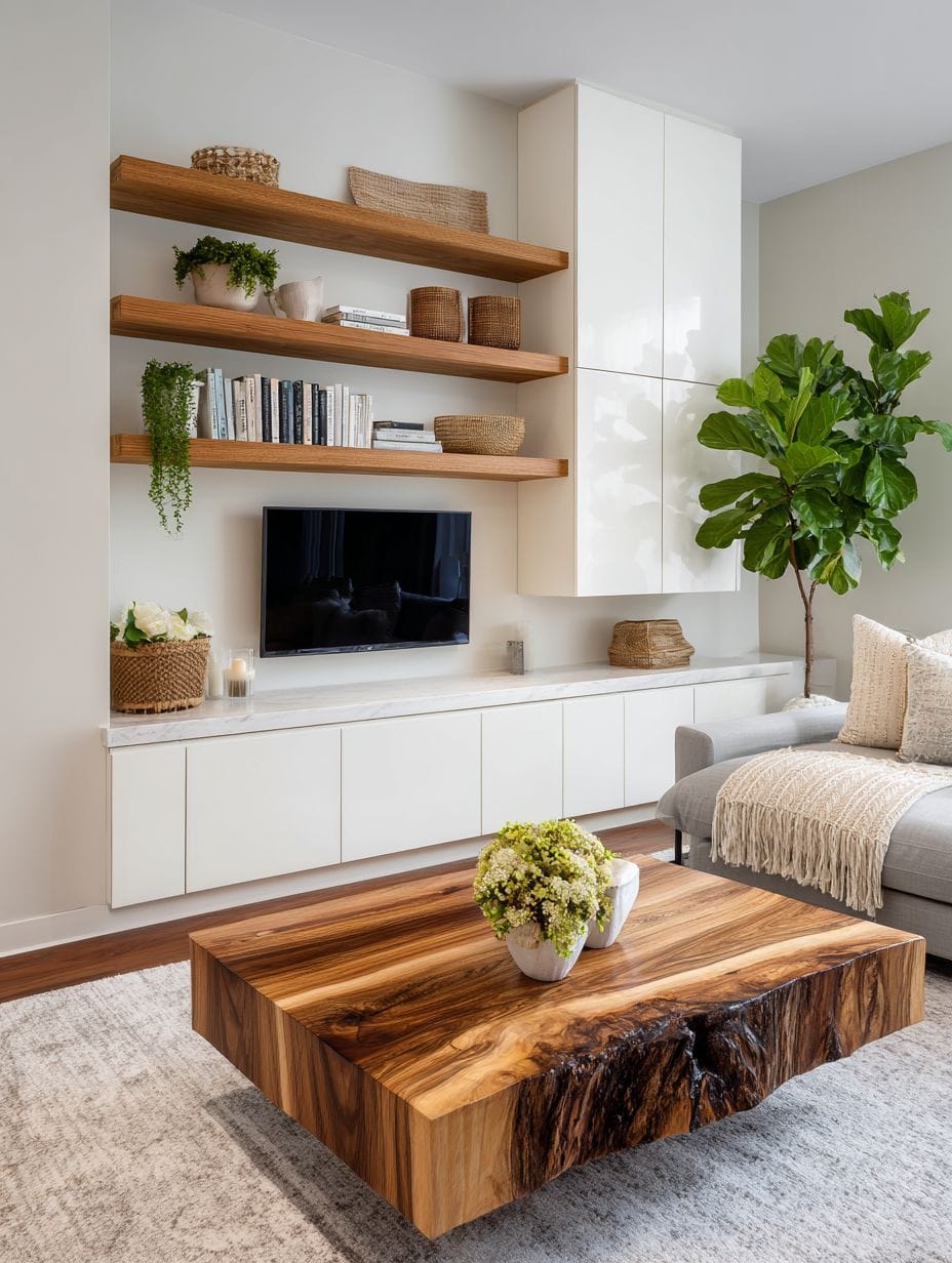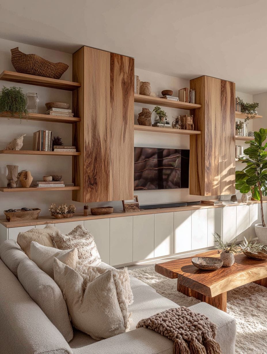 Above the console, a minimalist television is flanked by floating shelves in matching oak that display small potted plants and carefully selected books. These shelves break up the visual weight of the television screen and provide opportunities for personal expression through curated styling. The plants chosen for these shelves are intentionally small-scale and low-maintenance—succulents and small pothos—so they enhance without overwhelming or requiring excessive care. This practical consideration reflects the modern side of modern boho: beauty should not require impractical maintenance.