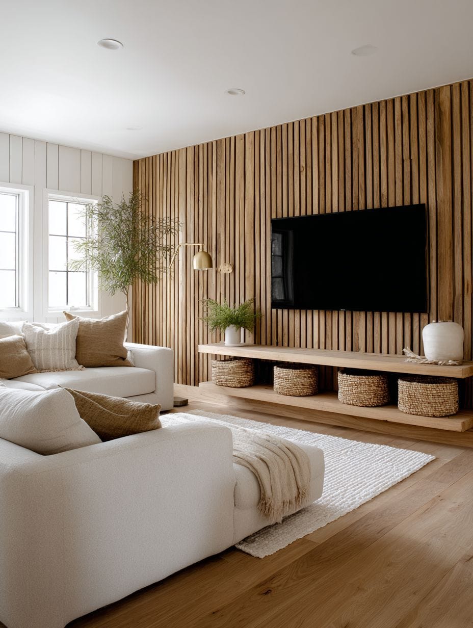 This final design showcases a minimalist media wall featuring horizontal wooden slats that create dramatic texture beneath a mounted television, transforming a necessary modern element into an intentional design feature. The wooden slats are distinctly contemporary in their geometric precision and horizontal installation, yet their natural material and visible grain bring organic warmth characteristic of bohemian style. This architectural treatment elevates the media wall beyond purely functional furniture, creating a focal point that remains attractive even when the television is off—an important consideration for spaces where screens dominate.